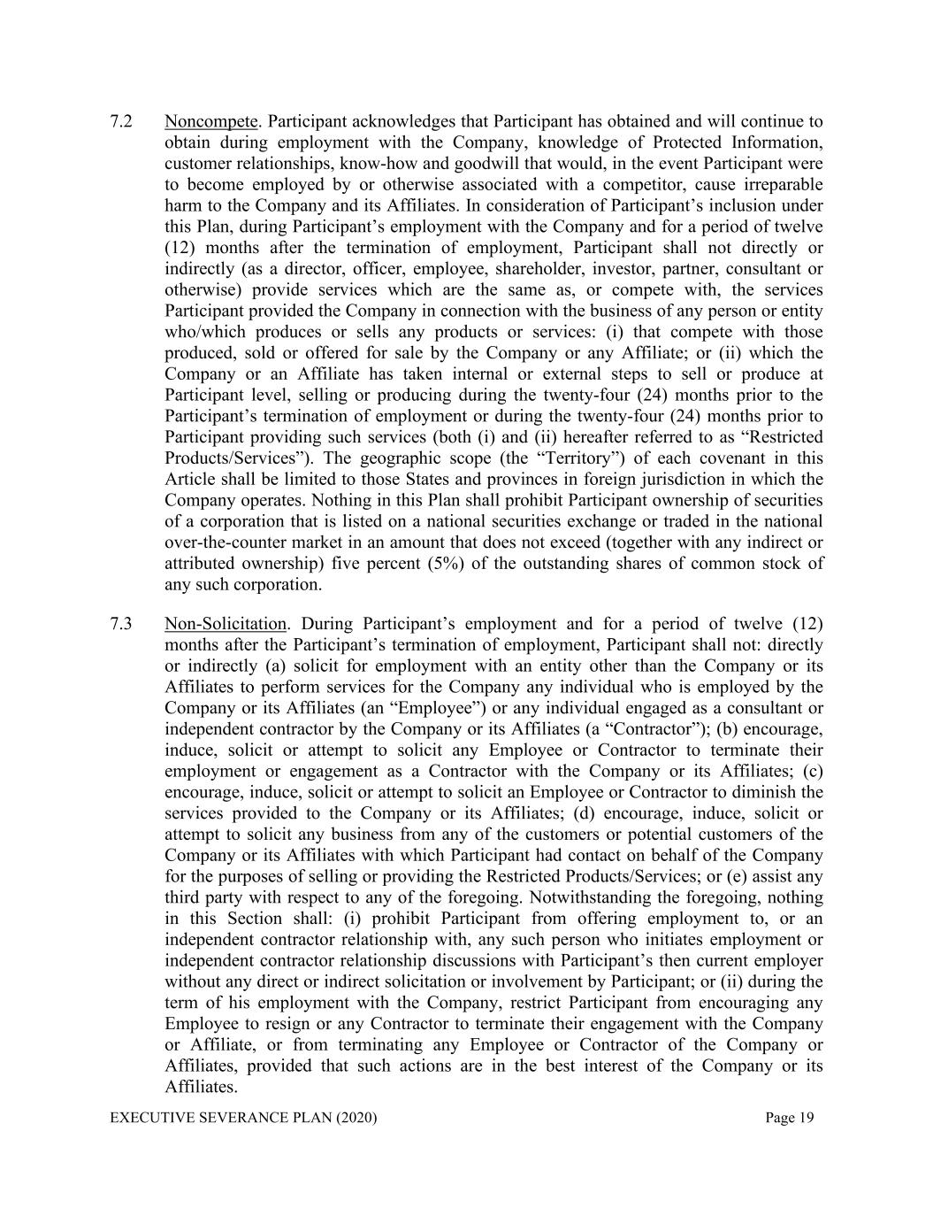EXECUTIVE SEVERANCE PLAN (2020) Page 19 7.2 Noncompete. Participant acknowledges that Participant has obtained and will continue to obtain during employment with the Company, knowledge of Protected Information, customer relationships, know-how and goodwill that would, in the event Participant were to become employed by or otherwise associated with a competitor, cause irreparable harm to the Company and its Affiliates. In consideration of Participant’s inclusion under this Plan, during Participant’s employment with the Company and for a period of twelve (12) months after the termination of employment, Participant shall not directly or indirectly (as a director, officer, employee, shareholder, investor, partner, consultant or otherwise) provide services which are the same as, or compete with, the services Participant provided the Company in connection with the business of any person or entity who/which produces or sells any products or services: (i) that compete with those produced, sold or offered for sale by the Company or any Affiliate; or (ii) which the Company or an Affiliate has taken internal or external steps to sell or produce at Participant level, selling or producing during the twenty-four (24) months prior to the Participant’s termination of employment or during the twenty-four (24) months prior to Participant providing such services (both (i) and (ii) hereafter referred to as “Restricted Products/Services”). The geographic scope (the “Territory”) of each covenant in this Article shall be limited to those States and provinces in foreign jurisdiction in which the Company operates. Nothing in this Plan shall prohibit Participant ownership of securities of a corporation that is listed on a national securities exchange or traded in the national over-the-counter market in an amount that does not exceed (together with any indirect or attributed ownership) five percent (5%) of the outstanding shares of common stock of any such corporation. 7.3 Non-Solicitation. During Participant’s employment and for a period of twelve (12) months after the Participant’s termination of employment, Participant shall not: directly or indirectly (a) solicit for employment with an entity other than the Company or its Affiliates to perform services for the Company any individual who is employed by the Company or its Affiliates (an “Employee”) or any individual engaged as a consultant or independent contractor by the Company or its Affiliates (a “Contractor”); (b) encourage, induce, solicit or attempt to solicit any Employee or Contractor to terminate their employment or engagement as a Contractor with the Company or its Affiliates; (c) encourage, induce, solicit or attempt to solicit an Employee or Contractor to diminish the services provided to the Company or its Affiliates; (d) encourage, induce, solicit or attempt to solicit any business from any of the customers or potential customers of the Company or its Affiliates with which Participant had contact on behalf of the Company for the purposes of selling or providing the Restricted Products/Services; or (e) assist any third party with respect to any of the foregoing. Notwithstanding the foregoing, nothing in this Section shall: (i) prohibit Participant from offering employment to, or an independent contractor relationship with, any such person who initiates employment or independent contractor relationship discussions with Participant’s then current employer without any direct or indirect solicitation or involvement by Participant; or (ii) during the term of his employment with the Company, restrict Participant from encouraging any Employee to resign or any Contractor to terminate their engagement with the Company or Affiliate, or from terminating any Employee or Contractor of the Company or Affiliates, provided that such actions are in the best interest of the Company or its Affiliates.