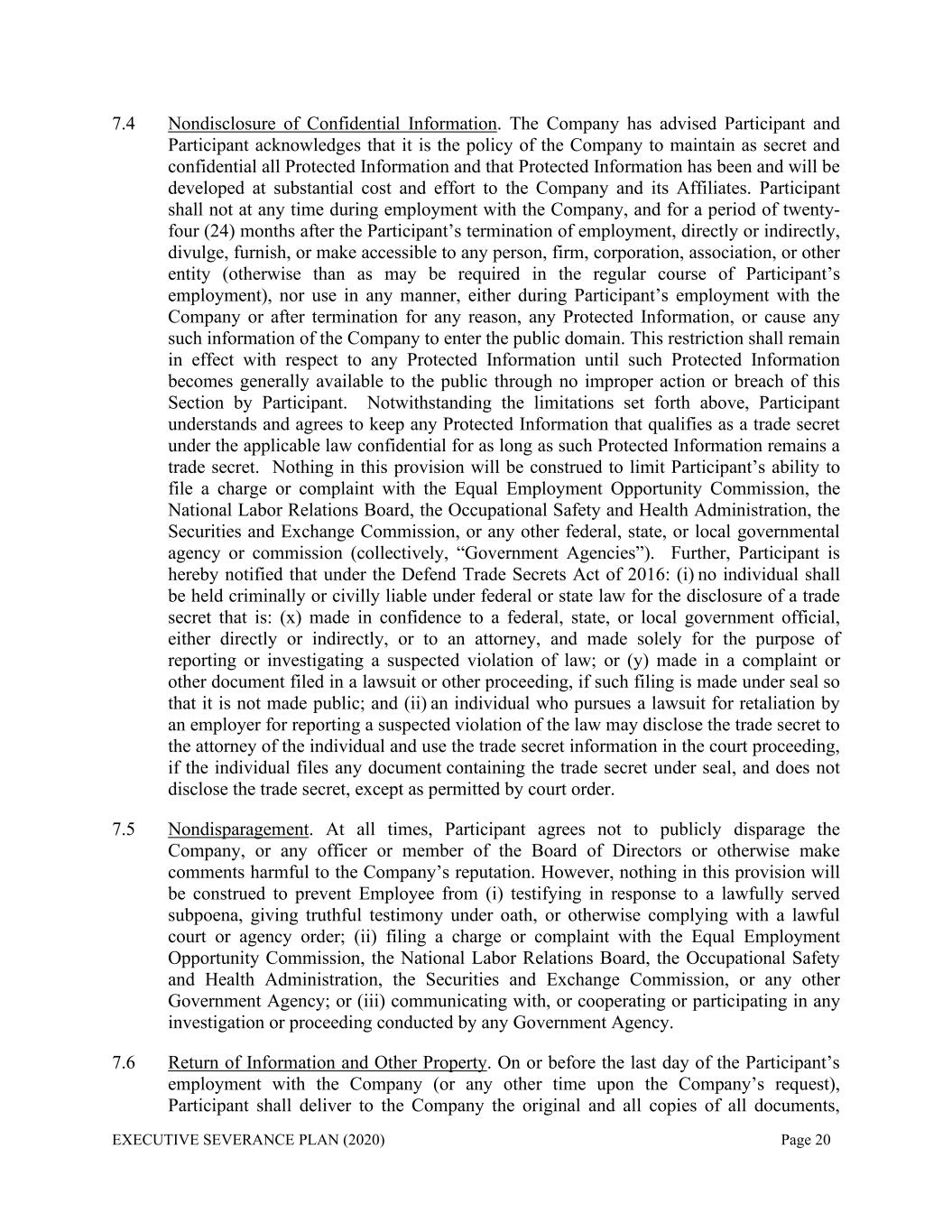 EXECUTIVE SEVERANCE PLAN (2020) Page 20 7.4 Nondisclosure of Confidential Information. The Company has advised Participant and Participant acknowledges that it is the policy of the Company to maintain as secret and confidential all Protected Information and that Protected Information has been and will be developed at substantial cost and effort to the Company and its Affiliates. Participant shall not at any time during employment with the Company, and for a period of twenty- four (24) months after the Participant’s termination of employment, directly or indirectly, divulge, furnish, or make accessible to any person, firm, corporation, association, or other entity (otherwise than as may be required in the regular course of Participant’s employment), nor use in any manner, either during Participant’s employment with the Company or after termination for any reason, any Protected Information, or cause any such information of the Company to enter the public domain. This restriction shall remain in effect with respect to any Protected Information until such Protected Information becomes generally available to the public through no improper action or breach of this Section by Participant. Notwithstanding the limitations set forth above, Participant understands and agrees to keep any Protected Information that qualifies as a trade secret under the applicable law confidential for as long as such Protected Information remains a trade secret. Nothing in this provision will be construed to limit Participant’s ability to file a charge or complaint with the Equal Employment Opportunity Commission, the National Labor Relations Board, the Occupational Safety and Health Administration, the Securities and Exchange Commission, or any other federal, state, or local governmental agency or commission (collectively, “Government Agencies”). Further, Participant is hereby notified that under the Defend Trade Secrets Act of 2016: (i) no individual shall be held criminally or civilly liable under federal or state law for the disclosure of a trade secret that is: (x) made in confidence to a federal, state, or local government official, either directly or indirectly, or to an attorney, and made solely for the purpose of reporting or investigating a suspected violation of law; or (y) made in a complaint or other document filed in a lawsuit or other proceeding, if such filing is made under seal so that it is not made public; and (ii) an individual who pursues a lawsuit for retaliation by an employer for reporting a suspected violation of the law may disclose the trade secret to the attorney of the individual and use the trade secret information in the court proceeding, if the individual files any document containing the trade secret under seal, and does not disclose the trade secret, except as permitted by court order. 7.5 Nondisparagement. At all times, Participant agrees not to publicly disparage the Company, or any officer or member of the Board of Directors or otherwise make comments harmful to the Company’s reputation. However, nothing in this provision will be construed to prevent Employee from (i) testifying in response to a lawfully served subpoena, giving truthful testimony under oath, or otherwise complying with a lawful court or agency order; (ii) filing a charge or complaint with the Equal Employment Opportunity Commission, the National Labor Relations Board, the Occupational Safety and Health Administration, the Securities and Exchange Commission, or any other Government Agency; or (iii) communicating with, or cooperating or participating in any investigation or proceeding conducted by any Government Agency. 7.6 Return of Information and Other Property. On or before the last day of the Participant’s employment with the Company (or any other time upon the Company’s request), Participant shall deliver to the Company the original and all copies of all documents,