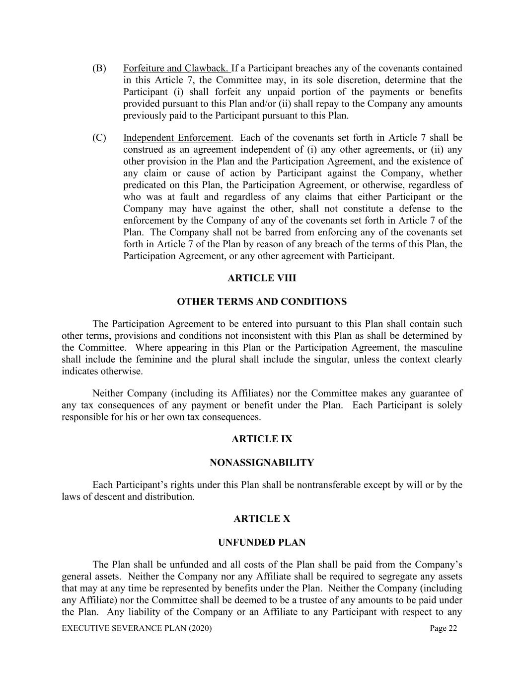 EXECUTIVE SEVERANCE PLAN (2020) Page 22 (B) Forfeiture and Clawback. If a Participant breaches any of the covenants contained in this Article 7, the Committee may, in its sole discretion, determine that the Participant (i) shall forfeit any unpaid portion of the payments or benefits provided pursuant to this Plan and/or (ii) shall repay to the Company any amounts previously paid to the Participant pursuant to this Plan. (C) Independent Enforcement. Each of the covenants set forth in Article 7 shall be construed as an agreement independent of (i) any other agreements, or (ii) any other provision in the Plan and the Participation Agreement, and the existence of any claim or cause of action by Participant against the Company, whether predicated on this Plan, the Participation Agreement, or otherwise, regardless of who was at fault and regardless of any claims that either Participant or the Company may have against the other, shall not constitute a defense to the enforcement by the Company of any of the covenants set forth in Article 7 of the Plan. The Company shall not be barred from enforcing any of the covenants set forth in Article 7 of the Plan by reason of any breach of the terms of this Plan, the Participation Agreement, or any other agreement with Participant. ARTICLE VIII OTHER TERMS AND CONDITIONS The Participation Agreement to be entered into pursuant to this Plan shall contain such other terms, provisions and conditions not inconsistent with this Plan as shall be determined by the Committee. Where appearing in this Plan or the Participation Agreement, the masculine shall include the feminine and the plural shall include the singular, unless the context clearly indicates otherwise. Neither Company (including its Affiliates) nor the Committee makes any guarantee of any tax consequences of any payment or benefit under the Plan. Each Participant is solely responsible for his or her own tax consequences. ARTICLE IX NONASSIGNABILITY Each Participant’s rights under this Plan shall be nontransferable except by will or by the laws of descent and distribution. ARTICLE X UNFUNDED PLAN The Plan shall be unfunded and all costs of the Plan shall be paid from the Company’s general assets. Neither the Company nor any Affiliate shall be required to segregate any assets that may at any time be represented by benefits under the Plan. Neither the Company (including any Affiliate) nor the Committee shall be deemed to be a trustee of any amounts to be paid under the Plan. Any liability of the Company or an Affiliate to any Participant with respect to any