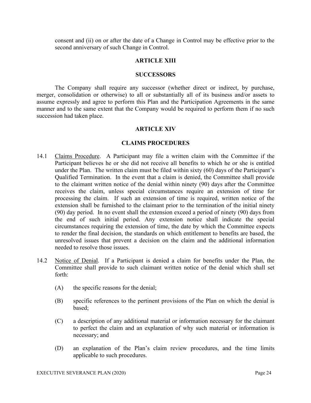EXECUTIVE SEVERANCE PLAN (2020) Page 24 consent and (ii) on or after the date of a Change in Control may be effective prior to the second anniversary of such Change in Control. ARTICLE XIII SUCCESSORS The Company shall require any successor (whether direct or indirect, by purchase, merger, consolidation or otherwise) to all or substantially all of its business and/or assets to assume expressly and agree to perform this Plan and the Participation Agreements in the same manner and to the same extent that the Company would be required to perform them if no such succession had taken place. ARTICLE XIV CLAIMS PROCEDURES 14.1 Claims Procedure. A Participant may file a written claim with the Committee if the Participant believes he or she did not receive all benefits to which he or she is entitled under the Plan. The written claim must be filed within sixty (60) days of the Participant’s Qualified Termination. In the event that a claim is denied, the Committee shall provide to the claimant written notice of the denial within ninety (90) days after the Committee receives the claim, unless special circumstances require an extension of time for processing the claim. If such an extension of time is required, written notice of the extension shall be furnished to the claimant prior to the termination of the initial ninety (90) day period. In no event shall the extension exceed a period of ninety (90) days from the end of such initial period. Any extension notice shall indicate the special circumstances requiring the extension of time, the date by which the Committee expects to render the final decision, the standards on which entitlement to benefits are based, the unresolved issues that prevent a decision on the claim and the additional information needed to resolve those issues. 14.2 Notice of Denial. If a Participant is denied a claim for benefits under the Plan, the Committee shall provide to such claimant written notice of the denial which shall set forth: (A) the specific reasons for the denial; (B) specific references to the pertinent provisions of the Plan on which the denial is based; (C) a description of any additional material or information necessary for the claimant to perfect the claim and an explanation of why such material or information is necessary; and (D) an explanation of the Plan’s claim review procedures, and the time limits applicable to such procedures.