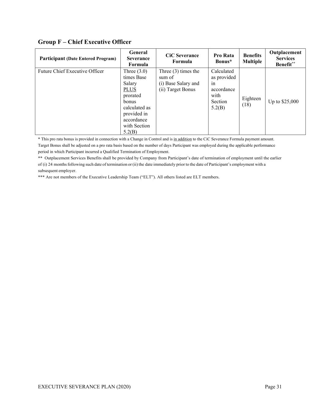 EXECUTIVE SEVERANCE PLAN (2020) Page 31 Group F – Chief Executive Officer Participant (Date Entered Program) General Severance Formula CiC Severance Formula Pro Rata Bonus* Benefits Multiple Outplacement Services Benefit** Future Chief Executive Officer Three (3.0) times Base Salary PLUS prorated bonus calculated as provided in accordance with Section 5.2(B) Three (3) times the sum of (i) Base Salary and (ii) Target Bonus Calculated as provided in accordance with Section 5.2(B) Eighteen (18) Up to $25,000 * This pro rata bonus is provided in connection with a Change in Control and is in addition to the CiC Severance Formula payment amount. Target Bonus shall be adjusted on a pro rata basis based on the number of days Participant was employed during the applicable performance period in which Participant incurred a Qualified Termination of Employment. ** Outplacement Services Benefits shall be provided by Company from Participant’s date of termination of employment until the earlier of (i) 24 months following such date of termination or (ii) the date immediately prior to the date of Participant’s employment with a subsequent employer. *** Are not members of the Executive Leadership Team (“ELT”). All others listed are ELT members.