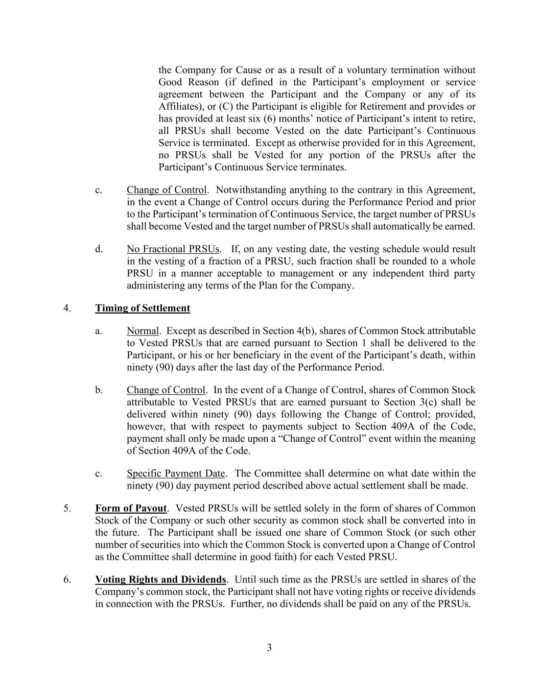3 the Company for Cause or as a result of a voluntary termination without Good Reason (if defined in the Participant’s employment or service agreement between the Participant and the Company or any of its Affiliates), or (C) the Participant is eligible for Retirement and provides or has provided at least six (6) months’ notice of Participant’s intent to retire, all PRSUs shall become Vested on the date Participant’s Continuous Service is terminated. Except as otherwise provided for in this Agreement, no PRSUs shall be Vested for any portion of the PRSUs after the Participant’s Continuous Service terminates. c. Change of Control. Notwithstanding anything to the contrary in this Agreement, in the event a Change of Control occurs during the Performance Period and prior to the Participant’s termination of Continuous Service, the target number of PRSUs shall become Vested and the target number of PRSUs shall automatically be earned. d. No Fractional PRSUs. If, on any vesting date, the vesting schedule would result in the vesting of a fraction of a PRSU, such fraction shall be rounded to a whole PRSU in a manner acceptable to management or any independent third party administering any terms of the Plan for the Company. 4. Timing of Settlement a. Normal. Except as described in Section 4(b), shares of Common Stock attributable to Vested PRSUs that are earned pursuant to Section 1 shall be delivered to the Participant, or his or her beneficiary in the event of the Participant’s death, within ninety (90) days after the last day of the Performance Period. b. Change of Control. In the event of a Change of Control, shares of Common Stock attributable to Vested PRSUs that are earned pursuant to Section 3(c) shall be delivered within ninety (90) days following the Change of Control; provided, however, that with respect to payments subject to Section 409A of the Code, payment shall only be made upon a “Change of Control” event within the meaning of Section 409A of the Code. c. Specific Payment Date. The Committee shall determine on what date within the ninety (90) day payment period described above actual settlement shall be made. 5. Form of Payout. Vested PRSUs will be settled solely in the form of shares of Common Stock of the Company or such other security as common stock shall be converted into in the future. The Participant shall be issued one share of Common Stock (or such other number of securities into which the Common Stock is converted upon a Change of Control as the Committee shall determine in good faith) for each Vested PRSU. 6. Voting Rights and Dividends. Until such time as the PRSUs are settled in shares of the Company’s common stock, the Participant shall not have voting rights or receive dividends in connection with the PRSUs. Further, no dividends shall be paid on any of the PRSUs.