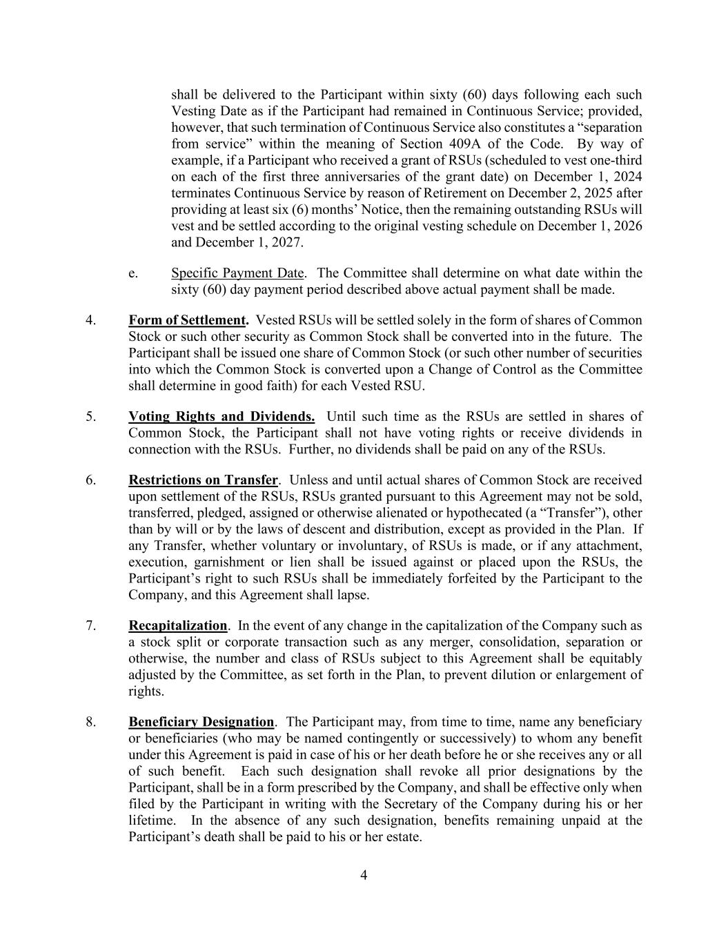 4 shall be delivered to the Participant within sixty (60) days following each such Vesting Date as if the Participant had remained in Continuous Service; provided, however, that such termination of Continuous Service also constitutes a “separation from service” within the meaning of Section 409A of the Code. By way of example, if a Participant who received a grant of RSUs (scheduled to vest one-third on each of the first three anniversaries of the grant date) on December 1, 2024 terminates Continuous Service by reason of Retirement on December 2, 2025 after providing at least six (6) months’ Notice, then the remaining outstanding RSUs will vest and be settled according to the original vesting schedule on December 1, 2026 and December 1, 2027. e. Specific Payment Date. The Committee shall determine on what date within the sixty (60) day payment period described above actual payment shall be made. 4. Form of Settlement. Vested RSUs will be settled solely in the form of shares of Common Stock or such other security as Common Stock shall be converted into in the future. The Participant shall be issued one share of Common Stock (or such other number of securities into which the Common Stock is converted upon a Change of Control as the Committee shall determine in good faith) for each Vested RSU. 5. Voting Rights and Dividends. Until such time as the RSUs are settled in shares of Common Stock, the Participant shall not have voting rights or receive dividends in connection with the RSUs. Further, no dividends shall be paid on any of the RSUs. 6. Restrictions on Transfer. Unless and until actual shares of Common Stock are received upon settlement of the RSUs, RSUs granted pursuant to this Agreement may not be sold, transferred, pledged, assigned or otherwise alienated or hypothecated (a “Transfer”), other than by will or by the laws of descent and distribution, except as provided in the Plan. If any Transfer, whether voluntary or involuntary, of RSUs is made, or if any attachment, execution, garnishment or lien shall be issued against or placed upon the RSUs, the Participant’s right to such RSUs shall be immediately forfeited by the Participant to the Company, and this Agreement shall lapse. 7. Recapitalization. In the event of any change in the capitalization of the Company such as a stock split or corporate transaction such as any merger, consolidation, separation or otherwise, the number and class of RSUs subject to this Agreement shall be equitably adjusted by the Committee, as set forth in the Plan, to prevent dilution or enlargement of rights. 8. Beneficiary Designation. The Participant may, from time to time, name any beneficiary or beneficiaries (who may be named contingently or successively) to whom any benefit under this Agreement is paid in case of his or her death before he or she receives any or all of such benefit. Each such designation shall revoke all prior designations by the Participant, shall be in a form prescribed by the Company, and shall be effective only when filed by the Participant in writing with the Secretary of the Company during his or her lifetime. In the absence of any such designation, benefits remaining unpaid at the Participant’s death shall be paid to his or her estate.