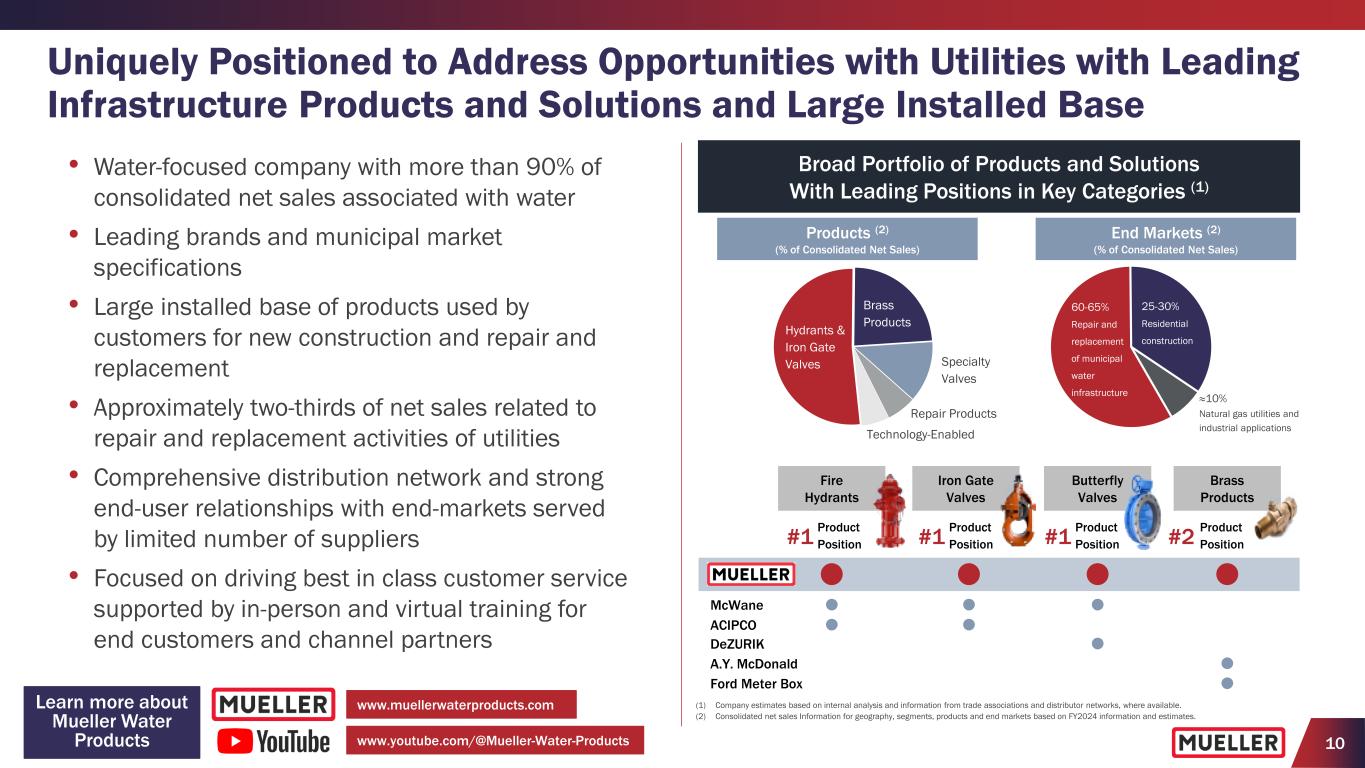 10 Leading Product Positions in Key Product Categories (1) (1) Company estimates based on internal analysis and information from trade associations and distributor networks, where available. (2) Consolidated net sales Information for geography, segments, products and end markets based on FY2024 information and estimates. Fire Hydrants Iron Gate Valves Butterfly Valves Brass Products #1 Product Position A.Y. McDonald ACIPCO DeZURIK Ford Meter Box McWane #1 Product Position #1 Product Position #2 Product Position Broad Portfolio of Products and Solutions With Leading Positions in Key Categories (1) Uniquely Positioned to Address Opportunities with Utilities with Leading Infrastructure Products and Solutions and Large Installed Base Products (2) (% of Consolidated Net Sales) End Markets (2) (% of Consolidated Net Sales) • Water-focused compa y with more than 90% of consolidated net sales associated with water • Leading brands and municipal market specifications • Large installed base of products used by customers for new construction and repair and replacement • Approximately two-thirds of net sales related to repair and replacement activities of utilities • Comprehensive distribution network and strong end-user relationships with end-markets served by limited number of suppliers • Focused on driving best in class customer service supported by in-person and virtual training for end customers and channel partners ≈10% Natural gas utilities and industrial applications 60-65% Repair and replacement of municipal water infrastructure 25-30% Residential construction Brass ProductsHydrants & Iron Gate Valves Specialty Valves Technology-Enabled Repair Products www.youtube.com/@Mueller-Water-Products www.muellerwaterproducts.comLearn more about Mueller Water Products