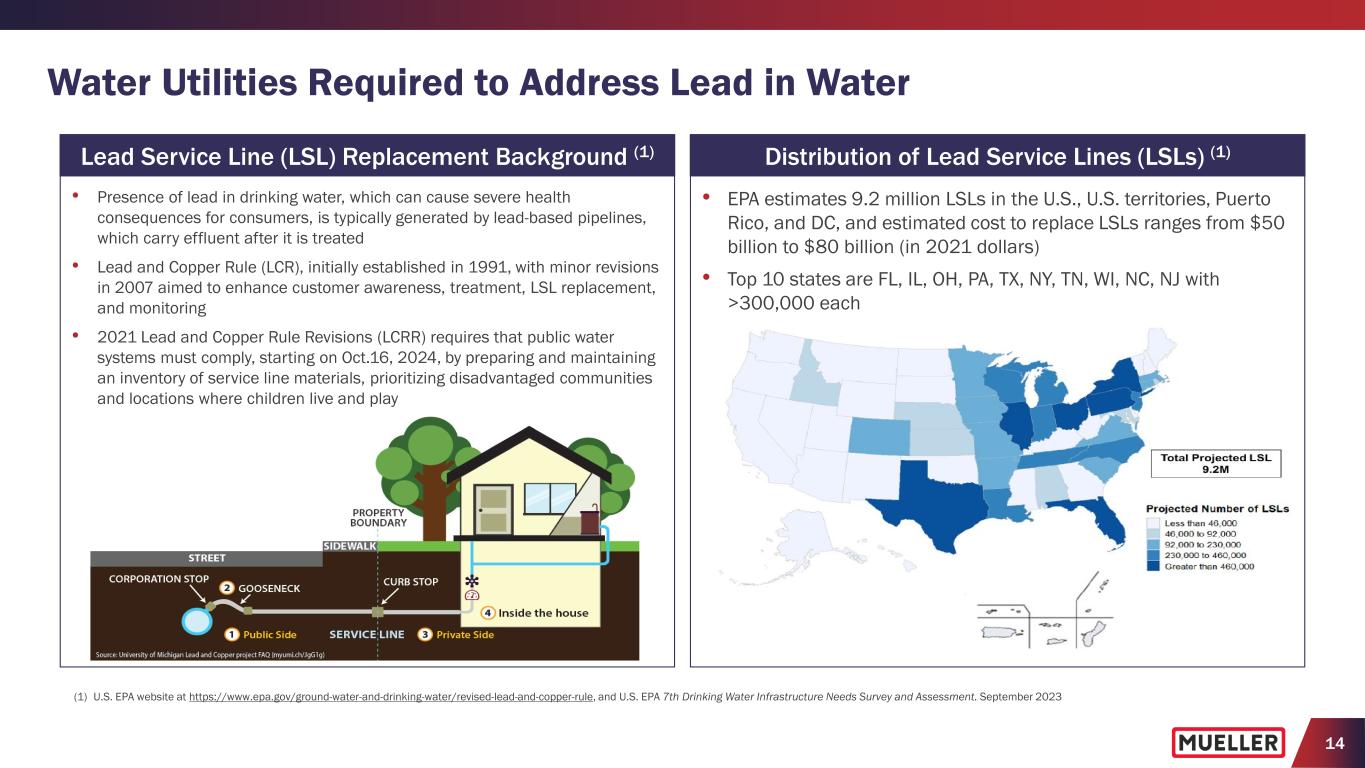 13 Historical Underinvestment in Aging Water Infrastructure Has Created Significant Funding Deficit (1) RAND Corporation 2017 Report titled “Not Everything is Broken.” (2) Bluefield Research report titled “Non-Revenue Water: U.S. Municipal Utility Water Losses, Costs, and Trends” published April 2025 (3) Bureau of Labor Statistics. (4) Securities Industry and Financial Markets Association (SIFMA) as of April 30, 2025. (5) Bluefield Research, May 2022, The Infrastructure Investment and Jobs Act: Breaking Down the Water Funding. (6) ASCE: 2025 Report Card for America’s Infrastructure (7) American Society of Civil Engineers. Bridging the Gap: The Power of Investment in Water. May 2024. Sources of Funding for U.S. Utilities • For U.S. utilities, 96% of funding at state/local government level (1) − Water losses cost U.S. Utilities roughly $6.4B annually in unrealized revenue for drinking water utilities, as nearly 20% of treated water in the U.S. is lost before it can generate revenue (2) − CPI for water and sewerage maintenance, which has historically exceeded CPI for all items and other utilities including natural gas, electricity, and postage, increased 5.2% during calendar 2024 compared with a 4.7% increase during calendar 2023 (3) − U.S. municipal bond issuance increased 33% y/y in calendar 2024 to $513 billion, with a 14.5% increase in issuance for YTD March 2025 period (4) − U.S. Federal government provides incentives for water utility projects such as Drinking Water State Revolving Funds (DWSRF) and Water Infrastructure Finance and Innovation Act (WIFIA) administered by the Environmental Protection Agency (EPA) • Infrastructure Investment and Jobs Act (“IIJA” or “Infrastructure Bill”), signed Nov. 15, 2021, includes $55 billion of new funding dedicated to water, wastewater and stormwater infrastructure (5) − Represents highest level of federal spending in inflation-adjusted dollars since the mid-1970s − $55 billion includes $15 billion for lead service line (LSL) replacements and $10 billion to help address emerging contaminants (i.e., PFAS) − Existing state revolving funds (drinking water and clean water) are primary ways for funding to get allocated to projects − Emphasis on directing funds towards small and disadvantaged communities either as grants or forgivable loans − Increases domestic procurement requirements, known as “Build America, Buy America" (BABA), from 55% to 75% over 8-years • ASCE grade for drinking water infrastructure is C- and grade for wastewater infrastructure is D+ (6) • Even if incremental IIJA funding establishes new capital investment baseline, annual investment gap will still grow to $146 billion by 2043 (7) • Should funding revert to pre-IIJA levels after 2026, the annual investment gap would grow to $161 billion by 2043 (7) Funding Gap Scenario: IIJA Spending Levels Remain Constant ($M) 2024 investment gap: $91 billion 2043 investment gap: $146 billion