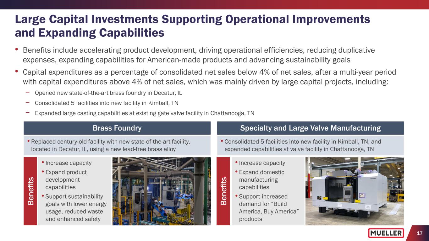 17 Large Capital Investments Supporting Operational Improvements and Expanding Capabilities • Benefits include accelerating product development, driving operational efficiencies, reducing duplicative expenses, expanding capabilities for American-made products and advancing sustainability goals • Capital expenditures as a percentage of consolidated net sales below 4% of net sales, after a multi-year period with capital expenditures above 4% of net sales, which was mainly driven by large capital projects, including: − Opened new state-of-the-art brass foundry in Decatur, IL − Consolidated 5 facilities into new facility in Kimball, TN − Expanded large casting capabilities at existing gate valve facility in Chattanooga, TN Brass Foundry • Replaced century-old facility with new state-of-the-art facility, located in Decatur, IL, using a new lead-free brass alloy Specialty and Large Valve Manufacturing • Consolidated 5 facilities into new facility in Kimball, TN, and expanded capabilities at valve facility in Chattanooga, TN • Increase capacity • Expand product development capabilities • Support sustainability goals with lower energy usage, reduced waste and enhanced safety • Increase capacity • Expand domestic manufacturing capabilities • Support increased demand for “Build America, Buy America” products Be ne fit s Be ne fit s