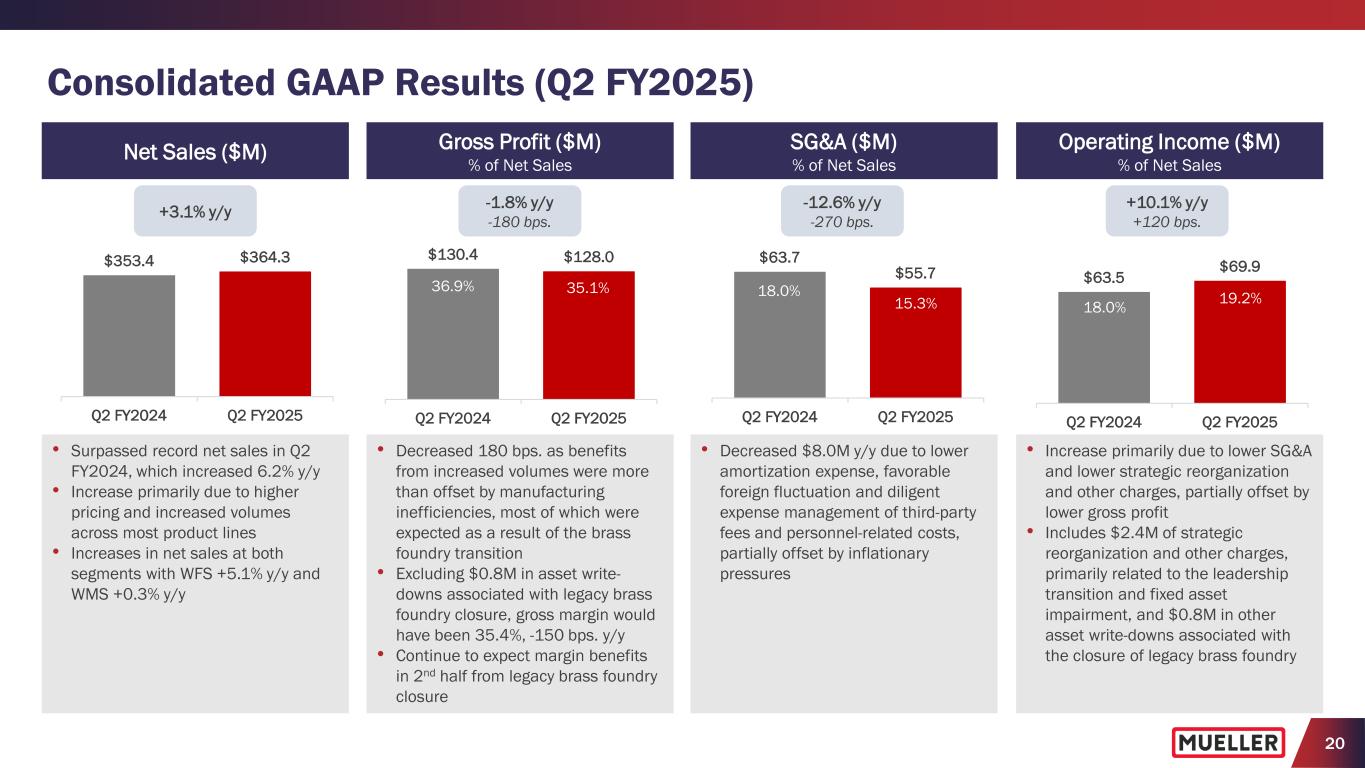 19 • Delivered solid performance, achieving new Q2 records for consolidated net sales, adjusted EBITDA and adjusted net income per share • Taking appropriate steps to mitigate the higher costs expected from newly enacted tariffs through pricing actions, supply chain mitigation plans, operational initiatives and cost discipline • Increasing guidance for 2025 Net Sales, and maintaining Adj. EBITDA guidance, due to higher costs associated with recently enacted tariffs • Confident in Mueller’s ability to adapt and overcome external challenges − Mueller has been a leading supplier of infrastructure products and solutions for >165 years − 92% of net sales in the U.S., and largely vertically integrated for our major product categories, like iron gate valves, hydrants and brass products − Estimate that 60% to 65% of net sales are used for the repair and replacement of municipal water infrastructure − Teams have been tested with many challenges before and after the pandemic Highlights (Q2 FY2025) (1) See Appendix for reconciliation of non-GAAP measures (Adjusted EBITDA, Adjusted Net Income per Diluted Share, Free Cash Flow) to their corresponding GAAP measures. Q2 Fiscal 2025 (1) (y/y or bps. vs. Fiscal 2024) Net Sales $364.3M +3.1% Gross Margin 35.1% -180 bps. Adjusted EBITDA $84.5M +2.8% Free Cash Flow $5.1M +$20.9M Adjusted Net Income per Diluted Share $0.34 +13.3% YTD $668.6M +9.6% 34.5% -100 bps. $148.0M +16.5% $0.59 +40.5% $47.3M +$0.9M