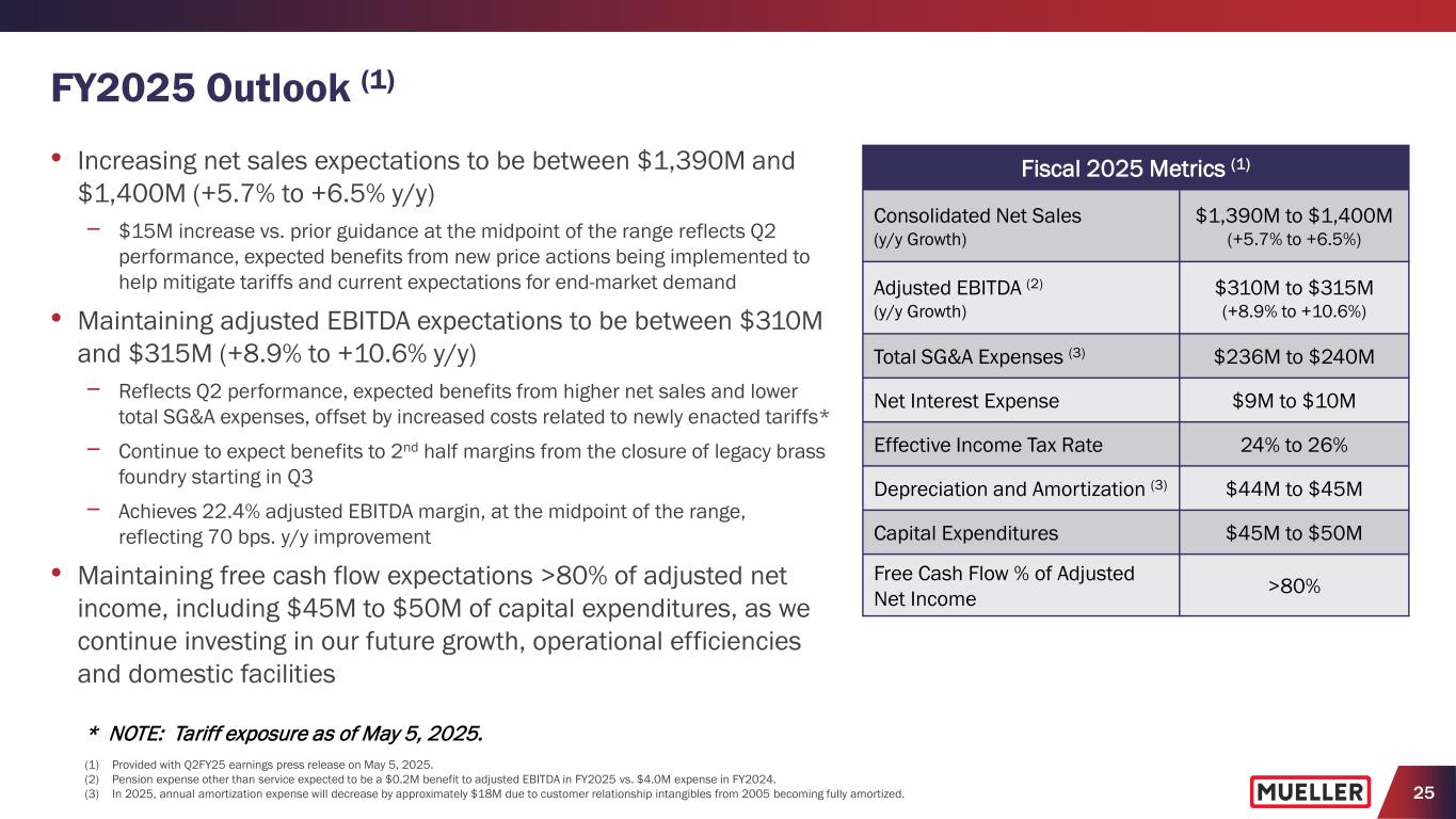 24 Credit Rating Debt Structure Debt Maturities Financial Covenants • $450M of 4.0% Senior Notes (mature June 2029) • Asset based lending agreement (“ABL”) provides up to $175M revolving credit facility subject to borrowing base (SOFR + 10 bps. + 150 to 175 bps.) with none outstanding (matures March 2029) • No financial maintenance covenants on 4.0% Senior Notes • ABL not subject to any financial maintenance covenants unless excess availability is less than the greater of $17.5M and 10% of the Loan Cap; consolidated Fixed Charge Ratio permitted to be <1x unless threshold is triggered Net Debt Leverage & Liquidity • $121.3M net debt with total debt of $450.5M and total cash of $329.2M as of March 31, 2025 (1) • Net debt leverage at 0.4x as of March 31, 2025 • No debt maturities prior to June 2029 • $492.2M of total liquidity, including $163.0M of excess availability under the ABL as of March 31, 2025 (1) 4.0% Senior Notes include $2.8M of deferred financing costs. $0 $0 $0 $0 $450 $0 $100 $200 $300 $400 $500 FY2025 FY2026 FY2027 FY2028 FY2029 FY E $ in m ill io ns No debt financing repayments prior to June 2029 Ample capacity, liquidity and flexibility to support our strategic priorities, including acquisitions • Moody’s: Ba1 Corporate and Notes Ratings, Stable Outlook • S&P: BB Corporate and Notes Ratings, Positive Outlook Strong Balance Sheet and Liquidity