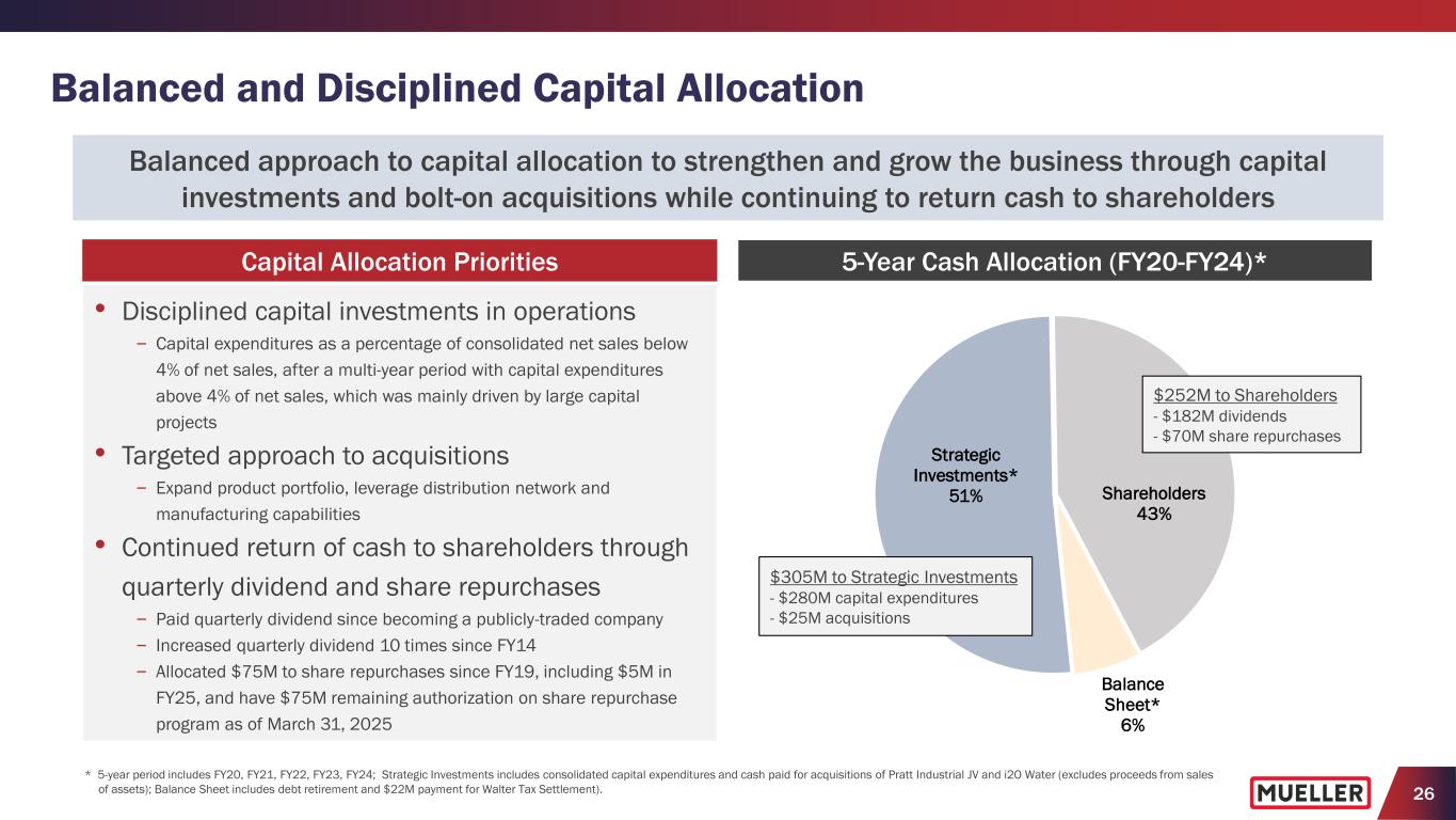 25 FY2025 Outlook (1) • Increasing net sales expectations to be between $1,390M and $1,400M (+5.7% to +6.5% y/y) − $15M increase vs. prior guidance at the midpoint of the range reflects Q2 performance, expected benefits from new price actions being implemented to help mitigate tariffs and current expectations for end-market demand • Maintaining adjusted EBITDA expectations to be between $310M and $315M (+8.9% to +10.6% y/y) − Reflects Q2 performance, expected benefits from higher net sales and lower total SG&A expenses, offset by increased costs related to newly enacted tariffs* − Continue to expect benefits to 2nd half margins from the closure of legacy brass foundry starting in Q3 − Achieves 22.4% adjusted EBITDA margin, at the midpoint of the range, reflecting 70 bps. y/y improvement • Maintaining free cash flow expectations >80% of adjusted net income, including $45M to $50M of capital expenditures, as we continue investing in our future growth, operational efficiencies and domestic facilities (1) Provided with Q2FY25 earnings press release on May 5, 2025. (2) Pension expense other than service expected to be a $0.2M benefit to adjusted EBITDA in FY2025 vs. $4.0M expense in FY2024. (3) In 2025, annual amortization expense will decrease by approximately $18M due to customer relationship intangibles from 2005 becoming fully amortized. Fiscal 2025 Metrics (1) Consolidated Net Sales (y/y Growth) $1,390M to $1,400M (+5.7% to +6.5%) Adjusted EBITDA (2) (y/y Growth) $310M to $315M (+8.9% to +10.6%) Total SG&A Expenses (3) $236M to $240M Net Interest Expense $9M to $10M Effective Income Tax Rate 24% to 26% Depreciation and Amortization (3) $44M to $45M Capital Expenditures $45M to $50M Free Cash Flow % of Adjusted Net Income >80% * NOTE: Tariff exposure as of May 5, 2025.