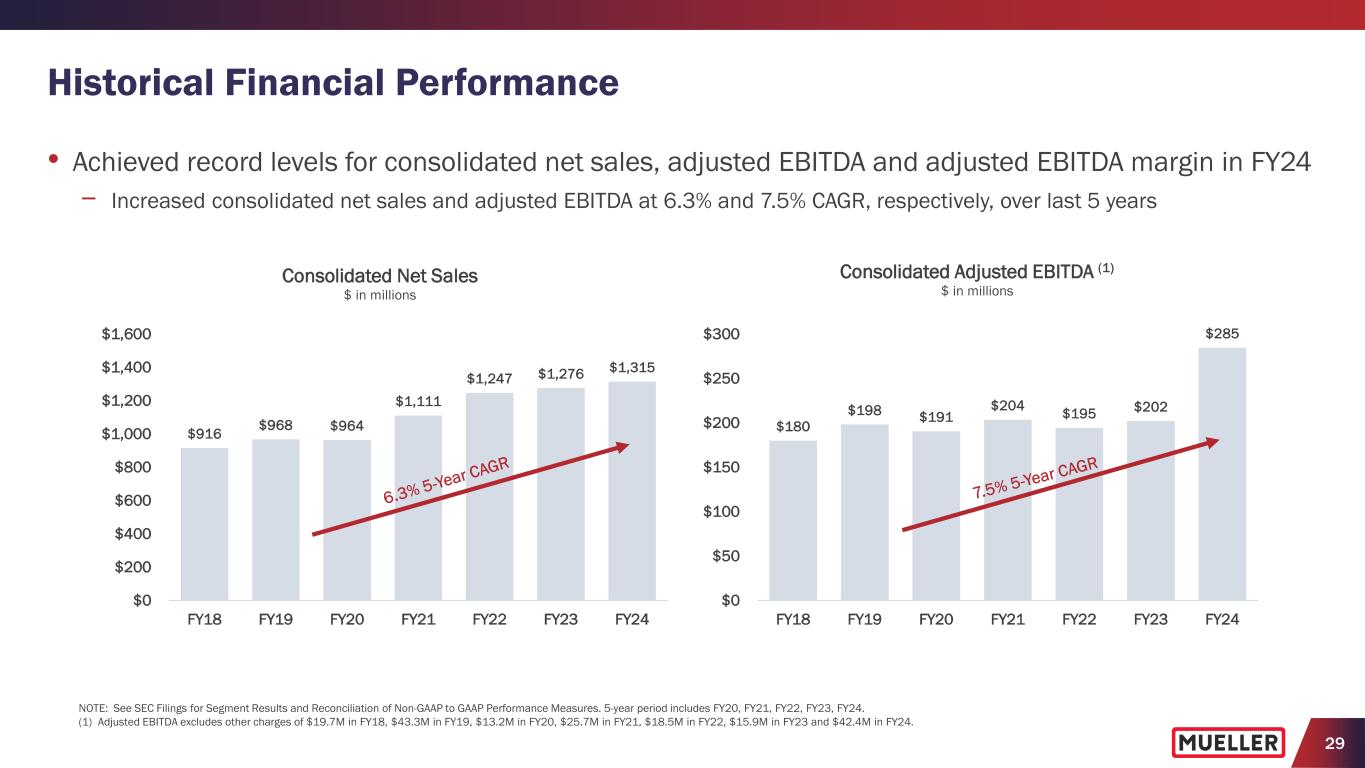 29 Historical Financial Performance • Achieved record levels for consolidated net sales, adjusted EBITDA and adjusted EBITDA margin in FY24 − Increased consolidated net sales and adjusted EBITDA at 6.3% and 7.5% CAGR, respectively, over last 5 years $916 $968 $964 $1,111 $1,247 $1,276 $1,315 $0 $200 $400 $600 $800 $1,000 $1,200 $1,400 $1,600 FY18 FY19 FY20 FY21 FY22 FY23 FY24 Consolidated Net Sales $ in millions $180 $198 $191 $204 $195 $202 $285 $0 $50 $100 $150 $200 $250 $300 FY18 FY19 FY20 FY21 FY22 FY23 FY24 Consolidated Adjusted EBITDA (1) $ in millions NOTE: See SEC Filings for Segment Results and Reconciliation of Non-GAAP to GAAP Performance Measures. 5-year period includes FY20, FY21, FY22, FY23, FY24. (1) Adjusted EBITDA excludes other charges of $19.7M in FY18, $43.3M in FY19, $13.2M in FY20, $25.7M in FY21, $18.5M in FY22, $15.9M in FY23 and $42.4M in FY24.