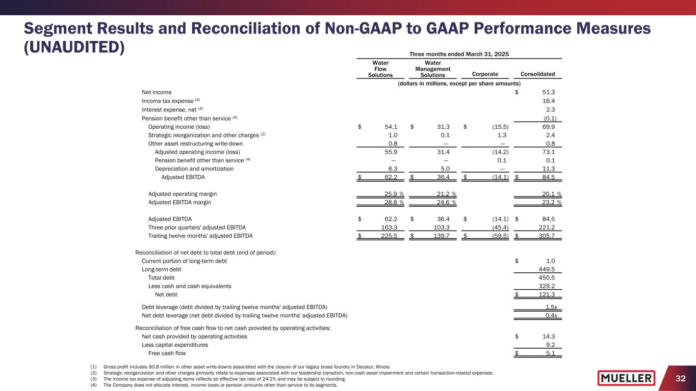 31 Segment Results and Reconciliation of Non-GAAP to GAAP Performance Measures (UNAUDITED) (1) Gross profit includes $0.8 million in other asset write-downs associated with the closure of our legacy brass foundry in Decatur, Illinois. (2) Strategic reorganization and other charges primarily relate to expenses associated with our leadership transition, non-cash asset impairment and certain transaction-related expenses. (3) The income tax expense of adjusting items reflects an effective tax rate of 24.2% and may be subject to rounding. Three months ended March 31, 2025 Water Flow Solutions Water Management Solutions Corporate Consolidated (dollars in millions, except per share amounts) Net sales $ 216.2 $ 148.1 $ — $ 364.3 Gross profit (1) $ 77.0 $ 51.0 $ — $ 128.0 Selling, general and administrative expenses 21.9 19.6 14.2 55.7 Strategic reorganization and other charges (2) 1.0 0.1 1.3 2.4 Operating income (loss) $ 54.1 $ 31.3 $ (15.5) $ 69.9 Operating margin 25.0 % 21.1 % 19.2 % Capital expenditures $ 4.8 $ 4.4 $ — $ 9.2 Net income $ 51.3 Net income margin 14.1 % Reconciliation of non-GAAP to GAAP performance measures: Net income $ 51.3 Strategic reorganization and other charges (2) 2.4 Other asset restructuring write-down 0.8 Income tax expense of adjusting items (3) (0.8) Adjusted net income $ 53.7 Weighted average diluted shares outstanding 157.5 Net income per diluted share $ 0.33 Strategic reorganization and other charges per diluted share (2) 0.02 Other asset restructuring write-down per diluted share 0.01 Income tax expense of adjusting items per diluted share (3) (0.02) Adjusted net income per diluted share $ 0.34