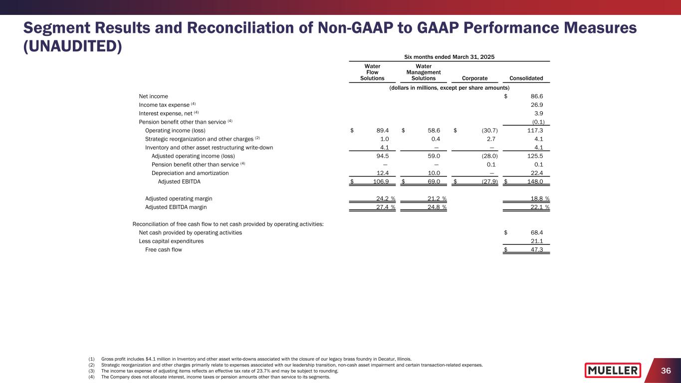 35 Segment Results and Reconciliation of Non-GAAP to GAAP Performance Measures (UNAUDITED) (1) Gross profit includes $4.1 million in Inventory and other asset write-downs associated with the closure of our legacy brass foundry in Decatur, Illinois. (2) Strategic reorganization and other charges primarily relate to expenses associated with our leadership transition, non-cash asset impairment and certain transaction-related expenses. (3) The income tax expense of adjusting items reflects an effective tax rate of 23.7% and may be subject to rounding. Six months ended March 31, 2025 Water Flow Solutions Water Management Solutions Corporate Consolidated (dollars in millions, except per share amounts) Net sales $ 390.8 $ 277.8 $ — $ 668.6 Gross profit (1) $ 132.1 $ 98.9 $ — $ 231.0 Selling, general and administrative expenses 41.7 39.9 28.0 109.6 Strategic reorganization and other charges (2) 1.0 0.4 2.7 4.1 Operating income (loss) $ 89.4 $ 58.6 $ (30.7) $ 117.3 Operating margin 22.9 % 21.1 % 17.5 % Capital expenditures $ 10.5 $ 10.6 $ — $ 21.1 Net income $ 86.6 Net income margin 13.0 % Reconciliation of non-GAAP to GAAP performance measures: Net income $ 86.6 Strategic reorganization and other charges (2) 4.1 Inventory and other asset restructuring write-down 4.1 Income tax expense of adjusting items (3) (1.9) Adjusted net income $ 92.9 Weighted average diluted shares outstanding 157.5 Net income per diluted share $ 0.55 Strategic reorganization and other charges per diluted share (2) 0.03 Inventory and other asset restructuring write-down per diluted share 0.03 Income tax expense of adjusting items per diluted share (3) (0.02) Adjusted net income per diluted share $ 0.59
