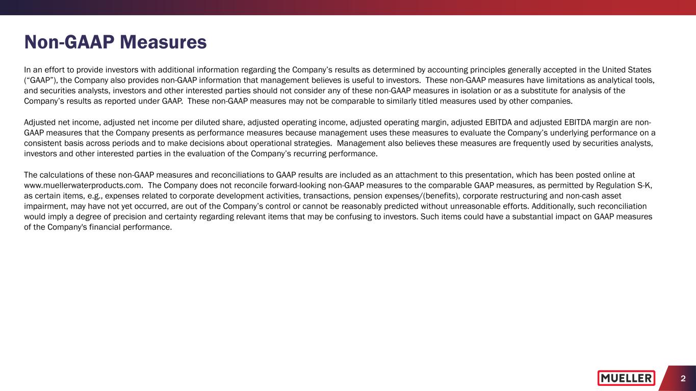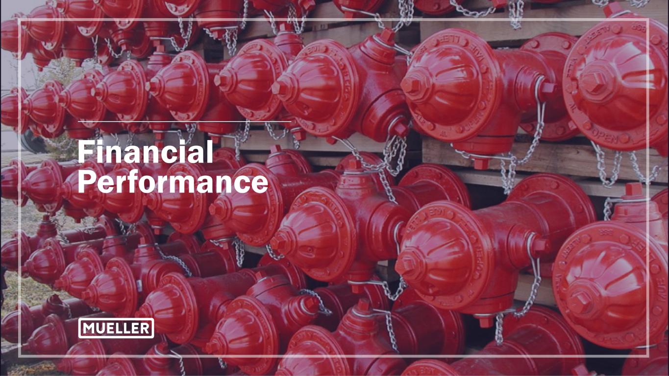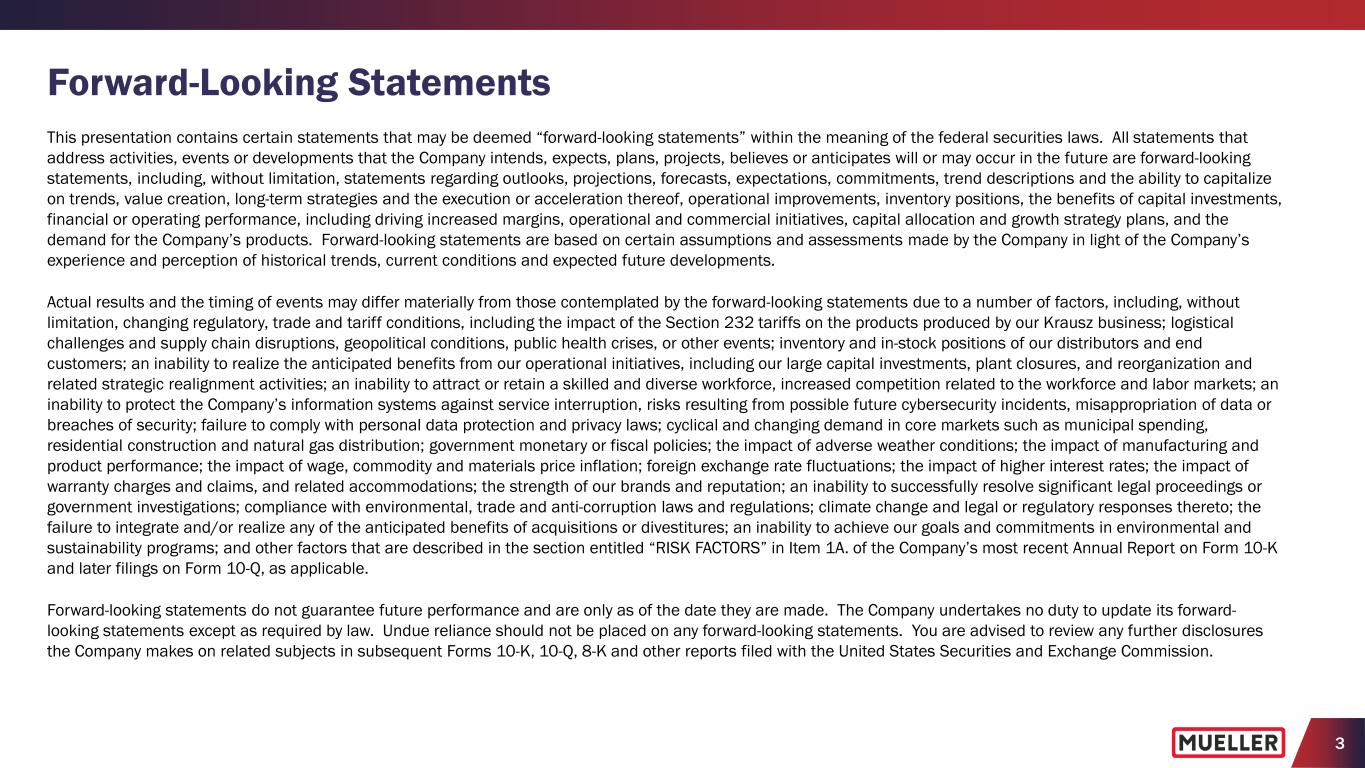 2 Non-GAAP Measures In an effort to provide investors with additional information regarding the Company’s results as determined by accounting principles generally accepted in the United States (“GAAP”), the Company also provides non-GAAP information that management believes is useful to investors. These non-GAAP measures have limitations as analytical tools, and securities analysts, investors and other interested parties should not consider any of these non-GAAP measures in isolation or as a substitute for analysis of the Company’s results as reported under GAAP. These non-GAAP measures may not be comparable to similarly titled measures used by other companies. Adjusted net income, adjusted net income per diluted share, adjusted operating income, adjusted operating margin, adjusted EBITDA and adjusted EBITDA margin are non- GAAP measures that the Company presents as performance measures because management uses these measures to evaluate the Company’s underlying performance on a consistent basis across periods and to make decisions about operational strategies. Management also believes these measures are frequently used by securities analysts, investors and other interested parties in the evaluation of the Company’s recurring performance. The calculations of these non-GAAP measures and reconciliations to GAAP results are included as an attachment to this presentation, which has been posted online at www.muellerwaterproducts.com. The Company does not reconcile forward-looking non-GAAP measures to the comparable GAAP measures, as permitted by Regulation S-K, as certain items, e.g., expenses related to corporate development activities, transactions, pension expenses/(benefits), corporate restructuring and non-cash asset impairment, may have not yet occurred, are out of the Company’s control or cannot be reasonably predicted without unreasonable efforts. Additionally, such reconciliation would imply a degree of precision and certainty regarding relevant items that may be confusing to investors. Such items could have a substantial impact on GAAP measures of the Company's financial performance.