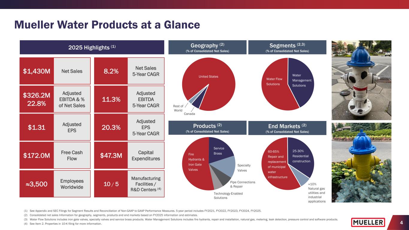3 Forward-Looking Statements This presentation contains certain statements that may be deemed “forward-looking statements” within the meaning of the federal securities laws. All statements that address activities, events or developments that the Company intends, expects, plans, projects, believes or anticipates will or may occur in the future are forward-looking statements, including, without limitation, statements regarding outlooks, projections, forecasts, expectations, commitments, trend descriptions and the ability to capitalize on trends, value creation, long-term strategies and the execution or acceleration thereof, operational improvements, inventory positions, the benefits of capital investments, financial or operating performance, including driving increased margins, operational and commercial initiatives, capital allocation and growth strategy plans, and the demand for the Company’s products. Forward-looking statements are based on certain assumptions and assessments made by the Company in light of the Company’s experience and perception of historical trends, current conditions and expected future developments. Actual results and the timing of events may differ materially from those contemplated by the forward-looking statements due to a number of factors, including, without limitation, changing regulatory, trade and tariff conditions, including the impact of the Section 232 tariffs on the products produced by our Krausz business; logistical challenges and supply chain disruptions, geopolitical conditions, public health crises, or other events; inventory and in-stock positions of our distributors and end customers; an inability to realize the anticipated benefits from our operational initiatives, including our large capital investments, plant closures, and reorganization and related strategic realignment activities; an inability to attract or retain a skilled and diverse workforce, increased competition related to the workforce and labor markets; an inability to protect the Company’s information systems against service interruption, risks resulting from possible future cybersecurity incidents, misappropriation of data or breaches of security; failure to comply with personal data protection and privacy laws; cyclical and changing demand in core markets such as municipal spending, residential construction and natural gas distribution; government monetary or fiscal policies; the impact of adverse weather conditions; the impact of manufacturing and product performance; the impact of wage, commodity and materials price inflation; foreign exchange rate fluctuations; the impact of higher interest rates; the impact of warranty charges and claims, and related accommodations; the strength of our brands and reputation; an inability to successfully resolve significant legal proceedings or government investigations; compliance with environmental, trade and anti-corruption laws and regulations; climate change and legal or regulatory responses thereto; the failure to integrate and/or realize any of the anticipated benefits of acquisitions or divestitures; an inability to achieve our goals and commitments in environmental and sustainability programs; and other factors that are described in the section entitled “RISK FACTORS” in Item 1A. of the Company’s most recent Annual Report on Form 10-K and later filings on Form 10-Q, as applicable. Forward-looking statements do not guarantee future performance and are only as of the date they are made. The Company undertakes no duty to update its forward- looking statements except as required by law. Undue reliance should not be placed on any forward-looking statements. You are advised to review any further disclosures the Company makes on related subjects in subsequent Forms 10-K, 10-Q, 8-K and other reports filed with the United States Securities and Exchange Commission.
