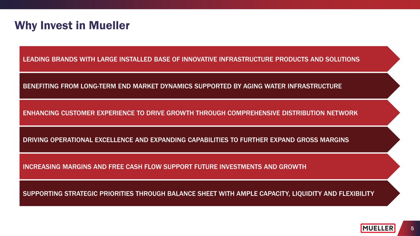 4 (1) See Appendix and SEC Filings for Segment Results and Reconciliation of Non-GAAP to GAAP Performance Measures. 5-year period includes FY2021, FY2022, FY2023, FY2024, FY2025. (2) Consolidated net sales Information for geography, segments, products and end markets based on FY2025 information and estimates. (3) Water Flow Solutions includes iron gate valves, specialty valves and service brass products. Water Management Solutions includes fire hydrants, repair and installation, natural gas, metering, leak detection, pressure control and software products. (4) See Item 2. Properties in 10-K filing for more information. Water Flow Solutions Water Management Solutions United States Rest of World Geography (2) (% of Consolidated Net Sales) Segments (2,3) (% of Consolidated Net Sales) ≈10% Natural gas utilities and industrial applications 60-65% Repair and replacement of municipal water infrastructure 25-30% Residential construction Service BrassFire Hydrants & Iron Gate Valves Specialty Valves Technology-Enabled Solutions Products (2) (% of Consolidated Net Sales) End Markets (2) (% of Consolidated Net Sales) Canada 2025 Highlights (1) $1,430M 8.2% $326.2M 22.8% 11.3% $172.0M $47.3M ≈3,500 10 / 5 Mueller Water Products at a Glance Pipe Connections & Repair Net Sales Adjusted EBITDA & % of Net Sales Free Cash Flow Employees Worldwide Manufacturing Facilities / R&D Centers (4) Net Sales 5-Year CAGR Adjusted EBITDA 5-Year CAGR Capital Expenditures $1.31 20.3%Adjusted EPS Adjusted EPS 5-Year CAGR