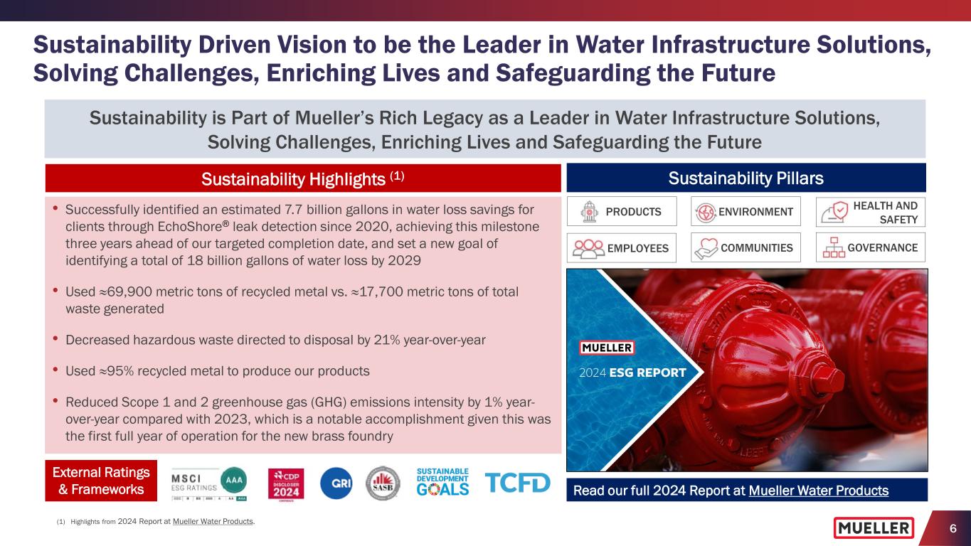 5 Why Invest in Mueller LEADING BRANDS WITH LARGE INSTALLED BASE OF INNOVATIVE INFRASTRUCTURE PRODUCTS AND SOLUTIONS BENEFITING FROM LONG-TERM END MARKET DYNAMICS SUPPORTED BY AGING WATER INFRASTRUCTURE DRIVING OPERATIONAL EXCELLENCE AND EXPANDING CAPABILITIES TO FURTHER EXPAND GROSS MARGINS ENHANCING CUSTOMER EXPERIENCE TO DRIVE GROWTH THROUGH COMPREHENSIVE DISTRIBUTION NETWORK INCREASING MARGINS AND FREE CASH FLOW SUPPORT FUTURE INVESTMENTS AND GROWTH SUPPORTING STRATEGIC PRIORITIES THROUGH BALANCE SHEET WITH AMPLE CAPACITY, LIQUIDITY AND FLEXIBILITY