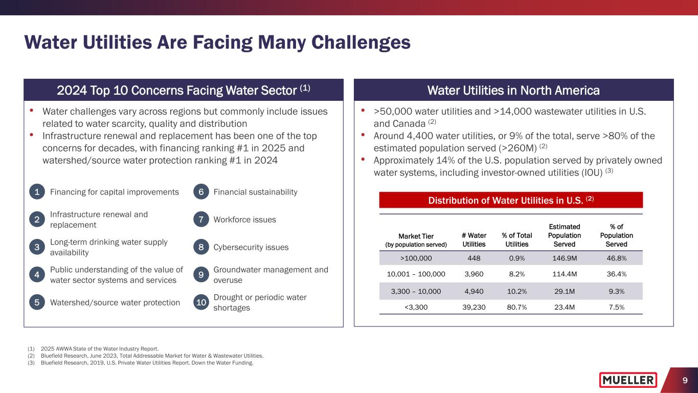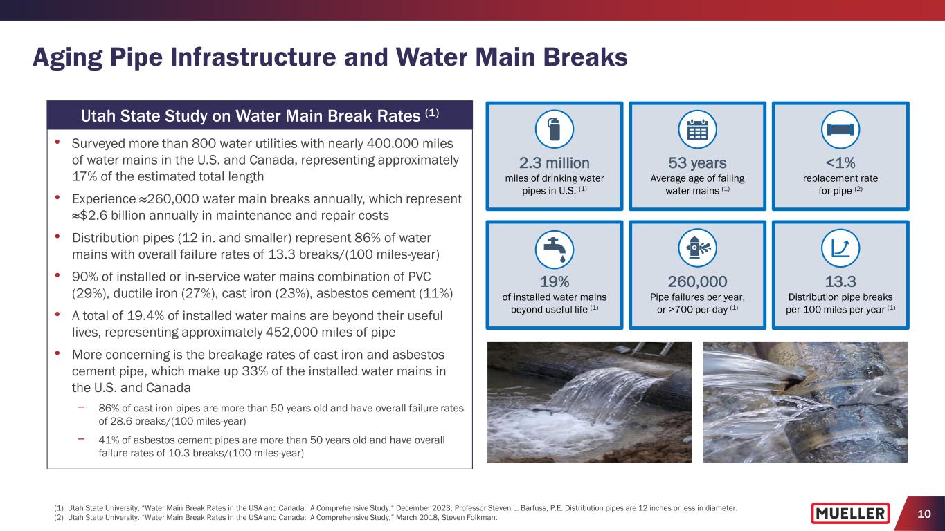 9 1 Financing for capital improvements 2 Infrastructure renewal and replacement 3 Long-term drinking water supply availability 4 Public understanding of the value of water sector systems and services 5 Watershed/source water protection • Water challenges vary across regions but commonly include issues related to water scarcity, quality and distribution • Infrastructure renewal and replacement has been one of the top concerns for decades, with financing ranking #1 in 2025 and watershed/source water protection ranking #1 in 2024 2024 Top 10 Concerns Facing Water Sector (1) 6 Financial sustainability 7 Workforce issues 8 Cybersecurity issues 9 Groundwater management and overuse 10 Drought or periodic water shortages • >50,000 water utilities and >14,000 wastewater utilities in U.S. and Canada (2) • Around 4,400 water utilities, or 9% of the total, serve >80% of the estimated population served (>260M) (2) • Approximately 14% of the U.S. population served by privately owned water systems, including investor-owned utilities (IOU) (3) Water Utilities in North America Market Tier (by population served) # Water Utilities % of Total Utilities Estimated Population Served % of Population Served >100,000 448 0.9% 146.9M 46.8% 10,001 – 100,000 3,960 8.2% 114.4M 36.4% 3,300 – 10,000 4,940 10.2% 29.1M 9.3% <3,300 39,230 80.7% 23.4M 7.5% Distribution of Water Utilities in U.S. (2) (1) 2025 AWWA State of the Water Industry Report. (2) Bluefield Research, June 2023, Total Addressable Market for Water & Wastewater Utilities. (3) Bluefield Research, 2019, U.S. Private Water Utilities Report. Down the Water Funding. Water Utilities Are Facing Many Challenges