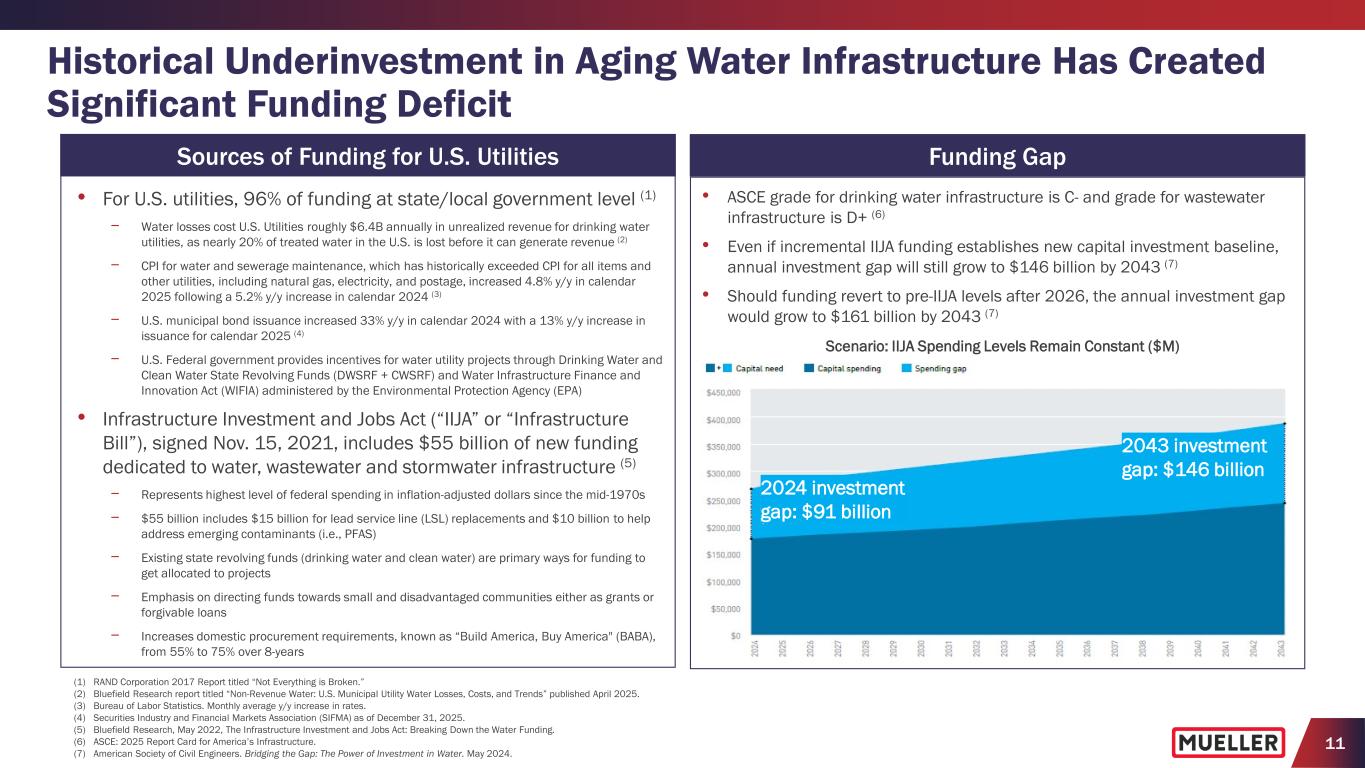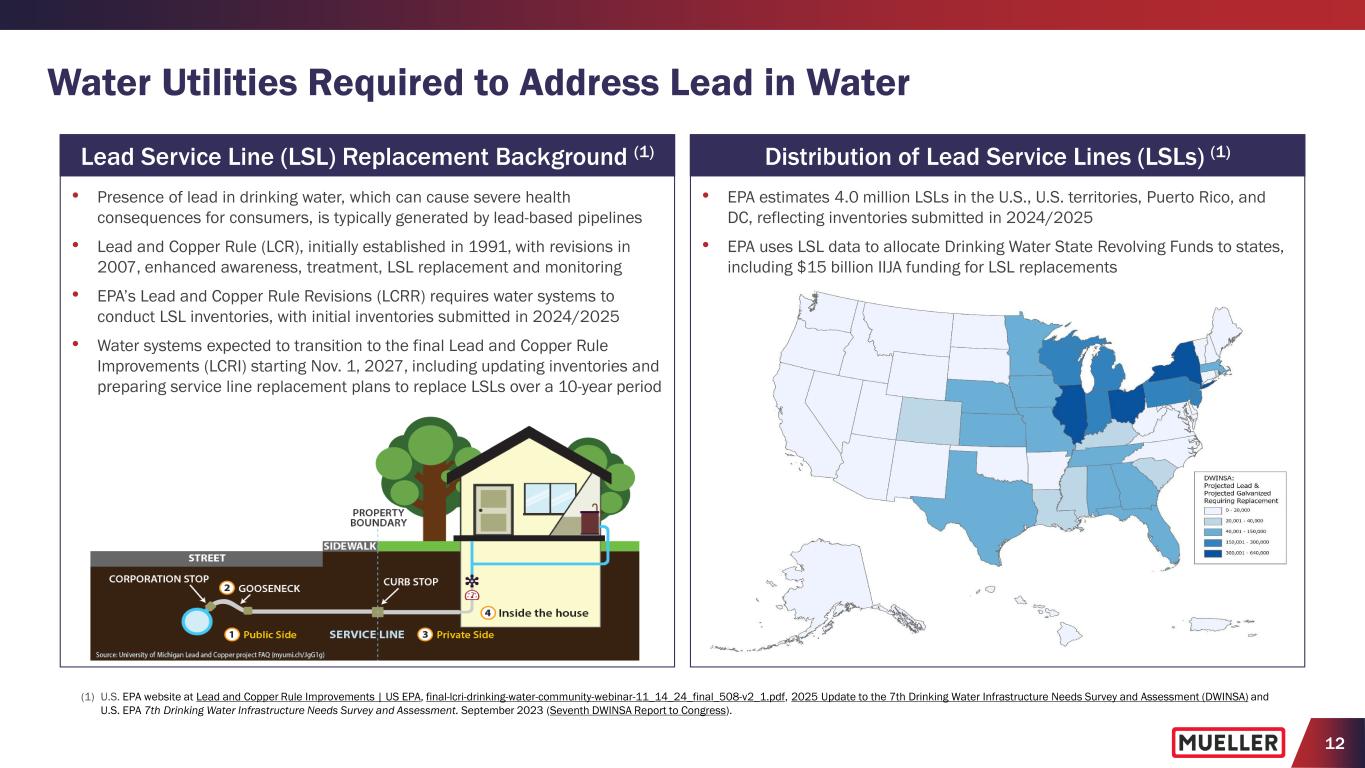 11 Historical Underinvestment in Aging Water Infrastructure Has Created Significant Funding Deficit (1) RAND Corporation 2017 Report titled “Not Everything is Broken.” (2) Bluefield Research report titled “Non-Revenue Water: U.S. Municipal Utility Water Losses, Costs, and Trends” published April 2025. (3) Bureau of Labor Statistics. Monthly average y/y increase in rates. (4) Securities Industry and Financial Markets Association (SIFMA) as of December 31, 2025. (5) Bluefield Research, May 2022, The Infrastructure Investment and Jobs Act: Breaking Down the Water Funding. (6) ASCE: 2025 Report Card for America’s Infrastructure. (7) American Society of Civil Engineers. Bridging the Gap: The Power of Investment in Water. May 2024. Sources of Funding for U.S. Utilities • For U.S. utilities, 96% of funding at state/local government level (1) − Water losses cost U.S. Utilities roughly $6.4B annually in unrealized revenue for drinking water utilities, as nearly 20% of treated water in the U.S. is lost before it can generate revenue (2) − CPI for water and sewerage maintenance, which has historically exceeded CPI for all items and other utilities, including natural gas, electricity, and postage, increased 4.8% y/y in calendar 2025 following a 5.2% y/y increase in calendar 2024 (3) − U.S. municipal bond issuance increased 33% y/y in calendar 2024 with a 13% y/y increase in issuance for calendar 2025 (4) − U.S. Federal government provides incentives for water utility projects through Drinking Water and Clean Water State Revolving Funds (DWSRF + CWSRF) and Water Infrastructure Finance and Innovation Act (WIFIA) administered by the Environmental Protection Agency (EPA) • Infrastructure Investment and Jobs Act (“IIJA” or “Infrastructure Bill”), signed Nov. 15, 2021, includes $55 billion of new funding dedicated to water, wastewater and stormwater infrastructure (5) − Represents highest level of federal spending in inflation-adjusted dollars since the mid-1970s − $55 billion includes $15 billion for lead service line (LSL) replacements and $10 billion to help address emerging contaminants (i.e., PFAS) − Existing state revolving funds (drinking water and clean water) are primary ways for funding to get allocated to projects − Emphasis on directing funds towards small and disadvantaged communities either as grants or forgivable loans − Increases domestic procurement requirements, known as “Build America, Buy America" (BABA), from 55% to 75% over 8-years • ASCE grade for drinking water infrastructure is C- and grade for wastewater infrastructure is D+ (6) • Even if incremental IIJA funding establishes new capital investment baseline, annual investment gap will still grow to $146 billion by 2043 (7) • Should funding revert to pre-IIJA levels after 2026, the annual investment gap would grow to $161 billion by 2043 (7) Funding Gap Scenario: IIJA Spending Levels Remain Constant ($M) 2024 investment gap: $91 billion 2043 investment gap: $146 billion