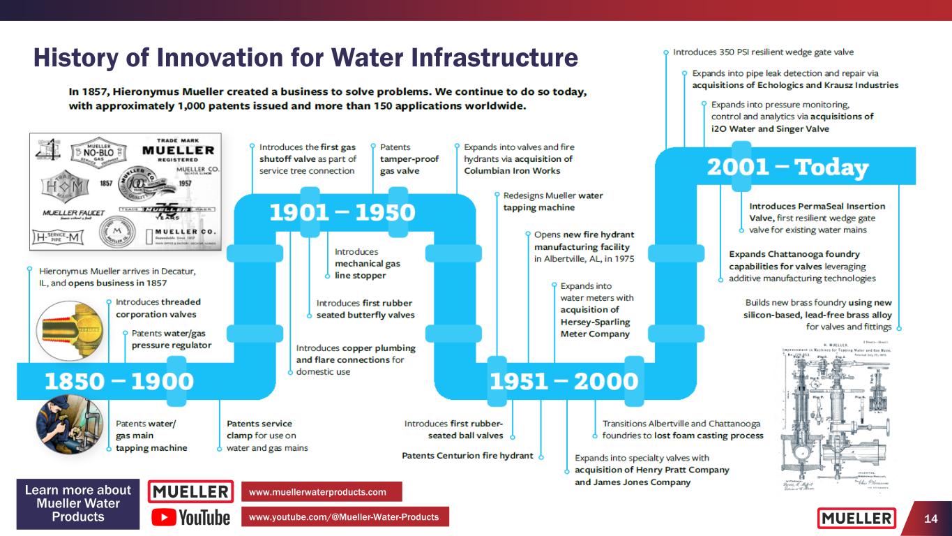 14 History of Innovation for Water Infrastructure www.youtube.com/@Mueller-Water-Products www.muellerwaterproducts.comLearn more about Mueller Water Products