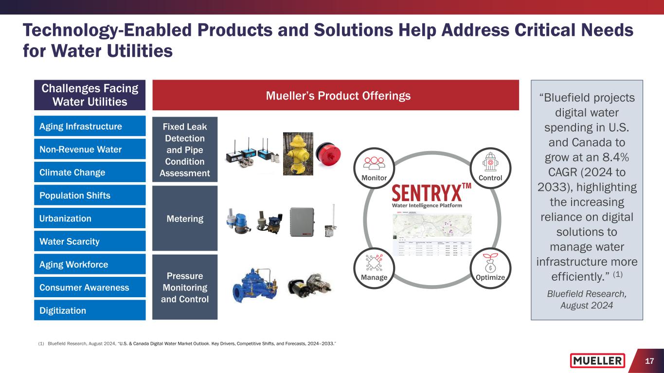 16 Leading Product Positions in Key Product Categories (1) (1) Company estimates based on internal analysis and information from trade associations and distributor networks, where available. (2) Consolidated net sales Information for geography, segments, products and end markets based on FY2025 information and estimates. Fire Hydrants Iron Gate Valves Butterfly Valves Brass Products #1 Product Position A.Y. McDonald ACIPCO DeZURIK Ford Meter Box McWane #1 Product Position #1 Product Position #2 Product Position Broad Portfolio of Products and Solutions With Leading Positions in Key Categories (1) Leading Brands and Specification Positions Supported by Strong Commercial Presence • Water-focused compa y with more than 90% of consolidated net sales associated with water • Leading brands and municipal market specifications • Large installed base of products used by customers for new construction and repair and replacement • Approximately two-thirds of net sales related to repair and replacement activities of utilities • Comprehensive distribution network and strong end-user relationships with end-markets served by limited number of suppliers • Focused on driving best in class customer service supported by in-person and virtual training for end customers and channel partners www.youtube.com/@Mueller-Water-Products www.muellerwaterproducts.comLearn more about Mueller Water Products ≈10% Natural gas utilities and industrial applications 60-65% Repair and replacement of municipal water infrastructure 25-30% Residential construction Service Brass Fire Hydrants & Iron Gate Valves Specialty Valves Technology-Enabled Solutions Products (2) (% of Consolidated Net Sales) End Markets (2) (% of Consolidated Net Sales) Pipe Connections & Repair