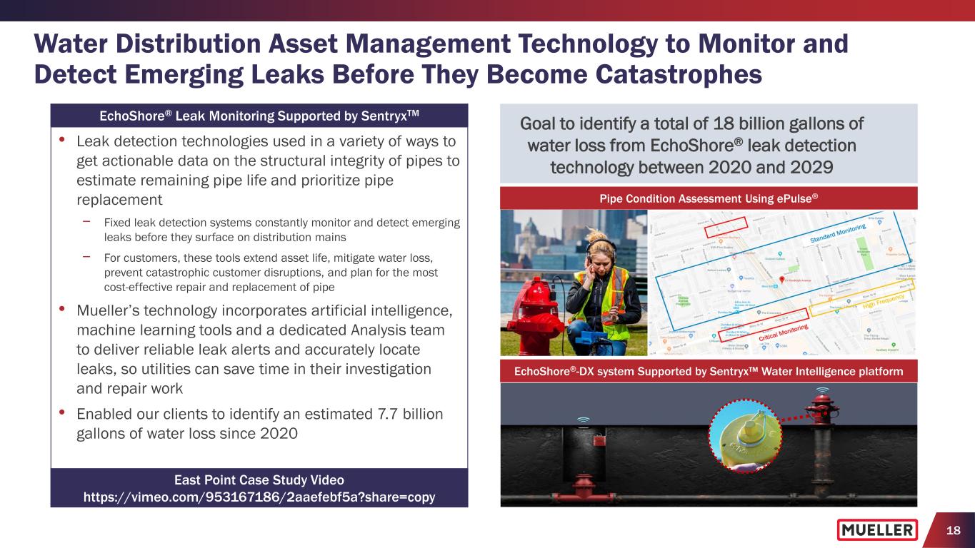 17 Technology-Enabled Products and Solutions Help Address Critical Needs for Water Utilities ControlMonitor Manage Optimize Mueller’s Product Offerings Aging Infrastructure Non-Revenue Water Climate Change Population Shifts Water Scarcity Aging Workforce Consumer Awareness Digitization Challenges Facing Water Utilities Urbanization Fixed Leak Detection and Pipe Condition Assessment Metering Pressure Monitoring and Control “Bluefield projects digital water spending in U.S. and Canada to grow at an 8.4% CAGR (2024 to 2033), highlighting the increasing reliance on digital solutions to manage water infrastructure more efficiently.” (1) Bluefield Research, August 2024 (1) Bluefield Research, August 2024, “U.S. & Canada Digital Water Market Outlook. Key Drivers, Competitive Shifts, and Forecasts, 2024–2033.”
