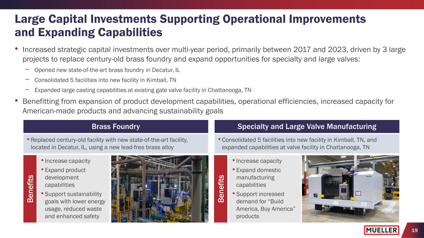 19 Large Capital Investments Supporting Operational Improvements and Expanding Capabilities • Increased strategic capital investments over multi-year period, primarily between 2017 and 2023, driven by 3 large projects to replace century-old brass foundry and expand opportunities for specialty and large valves: − Opened new state-of-the-art brass foundry in Decatur, IL − Consolidated 5 facilities into new facility in Kimball, TN − Expanded large casting capabilities at existing gate valve facility in Chattanooga, TN • Benefitting from expansion of product development capabilities, operational efficiencies, increased capacity for American-made products and advancing sustainability goals Brass Foundry • Replaced century-old facility with new state-of-the-art facility, located in Decatur, IL, using a new lead-free brass alloy Specialty and Large Valve Manufacturing • Consolidated 5 facilities into new facility in Kimball, TN, and expanded capabilities at valve facility in Chattanooga, TN • Increase capacity • Expand product development capabilities • Support sustainability goals with lower energy usage, reduced waste and enhanced safety • Increase capacity • Expand domestic manufacturing capabilities • Support increased demand for “Build America, Buy America” products Be ne fit s Be ne fit s