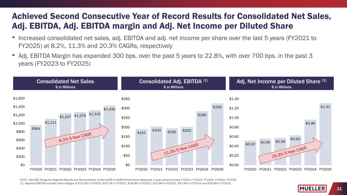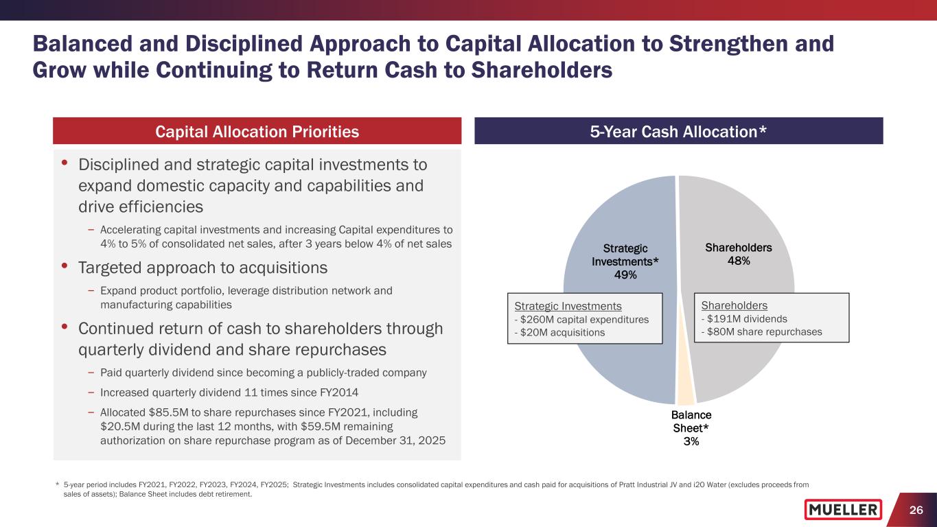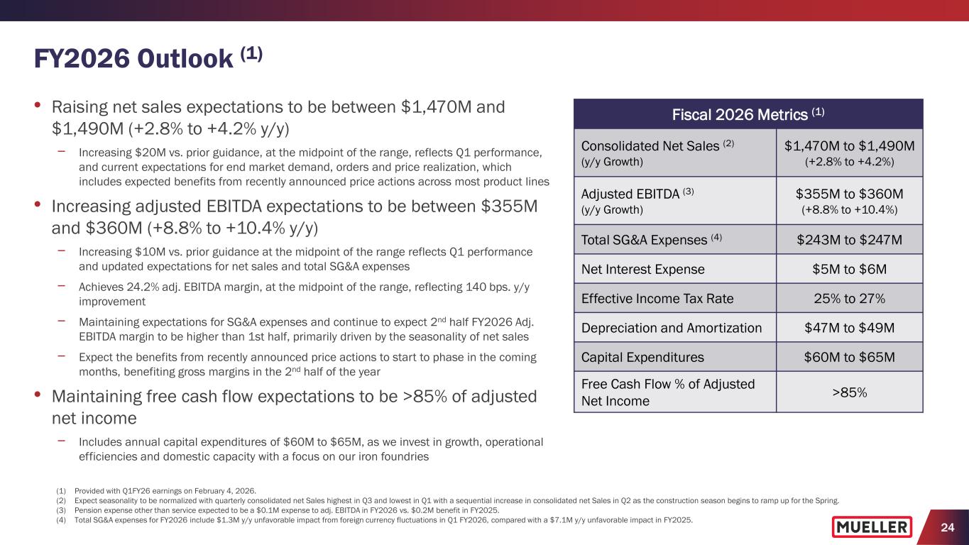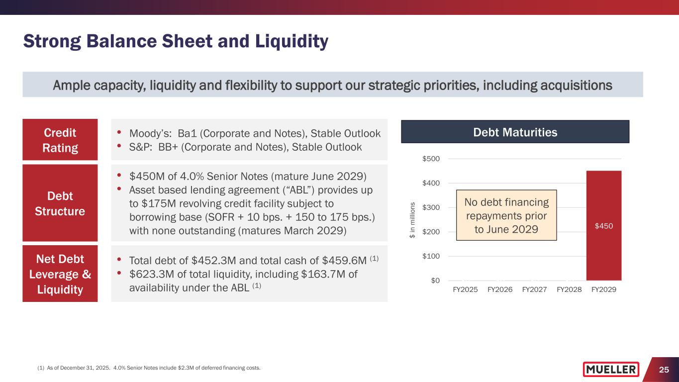 24 FY2026 Outlook (1) • Raising net sales expectations to be between $1,470M and $1,490M (+2.8% to +4.2% y/y) − Increasing $20M vs. prior guidance, at the midpoint of the range, reflects Q1 performance, and current expectations for end market demand, orders and price realization, which includes expected benefits from recently announced price actions across most product lines • Increasing adjusted EBITDA expectations to be between $355M and $360M (+8.8% to +10.4% y/y) − Increasing $10M vs. prior guidance at the midpoint of the range reflects Q1 performance and updated expectations for net sales and total SG&A expenses − Achieves 24.2% adj. EBITDA margin, at the midpoint of the range, reflecting 140 bps. y/y improvement − Maintaining expectations for SG&A expenses and continue to expect 2nd half FY2026 Adj. EBITDA margin to be higher than 1st half, primarily driven by the seasonality of net sales − Expect the benefits from recently announced price actions to start to phase in the coming months, benefiting gross margins in the 2nd half of the year • Maintaining free cash flow expectations to be >85% of adjusted net income − Includes annual capital expenditures of $60M to $65M, as we invest in growth, operational efficiencies and domestic capacity with a focus on our iron foundries (1) Provided with Q1FY26 earnings on February 4, 2026. (2) Expect seasonality to be normalized with quarterly consolidated net Sales highest in Q3 and lowest in Q1 with a sequential increase in consolidated net Sales in Q2 as the construction season begins to ramp up for the Spring. (3) Pension expense other than service expected to be a $0.1M expense to adj. EBITDA in FY2026 vs. $0.2M benefit in FY2025. (4) Total SG&A expenses for FY2026 include $1.3M y/y unfavorable impact from foreign currency fluctuations in Q1 FY2026, compared with a $7.1M y/y unfavorable impact in FY2025. Fiscal 2026 Metrics (1) Consolidated Net Sales (2) (y/y Growth) $1,470M to $1,490M (+2.8% to +4.2%) Adjusted EBITDA (3) (y/y Growth) $355M to $360M (+8.8% to +10.4%) Total SG&A Expenses (4) $243M to $247M Net Interest Expense $5M to $6M Effective Income Tax Rate 25% to 27% Depreciation and Amortization $47M to $49M Capital Expenditures $60M to $65M Free Cash Flow % of Adjusted Net Income >85%