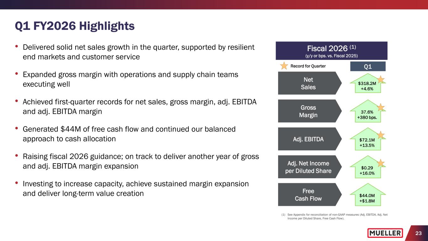 22 Growing Free Cash Flow Funds Strategic Investments and Returning Cash to Shareholders • Over the past 5 years, generated $516M of free cash flow, after investing $260M in capital expenditures • Over past 2 years, generated $363M of free cash flow, after investing $95M in capital expenditures − In fiscal 2025, delivered $172M free cash flow and 84% of adj. net income, which exceeded expectations, after investing $47M in capital expenditures (3.3% of net sales) • Accelerating capital investments to expand domestic capacity and capabilities and drive efficiencies, with capital expenditures increasing to 4% to 5% of net sales over the next 3 years ($67.7) ($62.7) ($54.7) ($47.6) ($47.4) ($47.3) $140.3 $156.7 $52.3 $109.0 $238.8 $219.3 $72.6 $94.0 ($2.4) $61.4 $191.4 $172.0 FY2020 FY2021 FY2022 FY2023 FY2024 FY2025 $ in M ill io ns Cash provided by operating activities Capital expenditures Free cash flow* * NOTE: Free Cash Flow = Cash provided by operating activities LESS Capital expenditures. See SEC Filings for Reconciliation of Non-GAAP to GAAP Performance Measures.