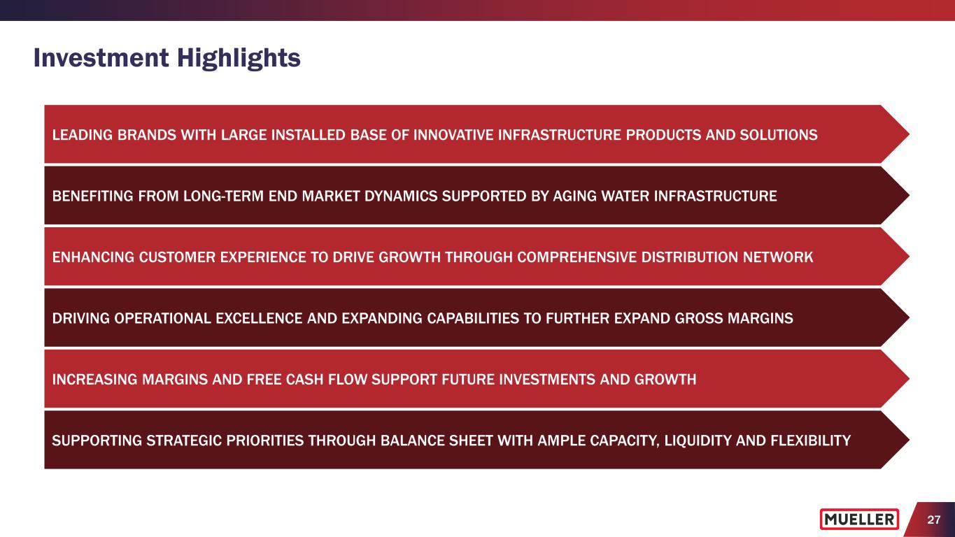 26 Balanced and Disciplined Approach to Capital Allocation to Strengthen and Grow while Continuing to Return Cash to Shareholders • Disciplined and strategic capital investments to expand domestic capacity and capabilities and drive efficiencies – Accelerating capital investments and increasing Capital expenditures to 4% to 5% of consolidated net sales, after 3 years below 4% of net sales • Targeted approach to acquisitions – Expand product portfolio, leverage distribution network and manufacturing capabilities • Continued return of cash to shareholders through quarterly dividend and share repurchases – Paid quarterly dividend since becoming a publicly-traded company – Increased quarterly dividend 11 times since FY2014 – Allocated $85.5M to share repurchases since FY2021, including $20.5M during the last 12 months, with $59.5M remaining authorization on share repurchase program as of December 31, 2025 Shareholders 48% Balance Sheet* 3% Strategic Investments* 49% Shareholders - $191M dividends - $80M share repurchases 5-Year Cash Allocation* Strategic Investments - $260M capital expenditures - $20M acquisitions * 5-year period includes FY2021, FY2022, FY2023, FY2024, FY2025; Strategic Investments includes consolidated capital expenditures and cash paid for acquisitions of Pratt Industrial JV and i2O Water (excludes proceeds from sales of assets); Balance Sheet includes debt retirement. Capital Allocation Priorities
