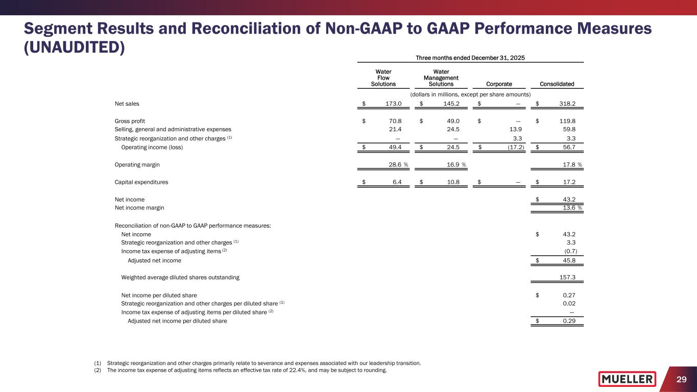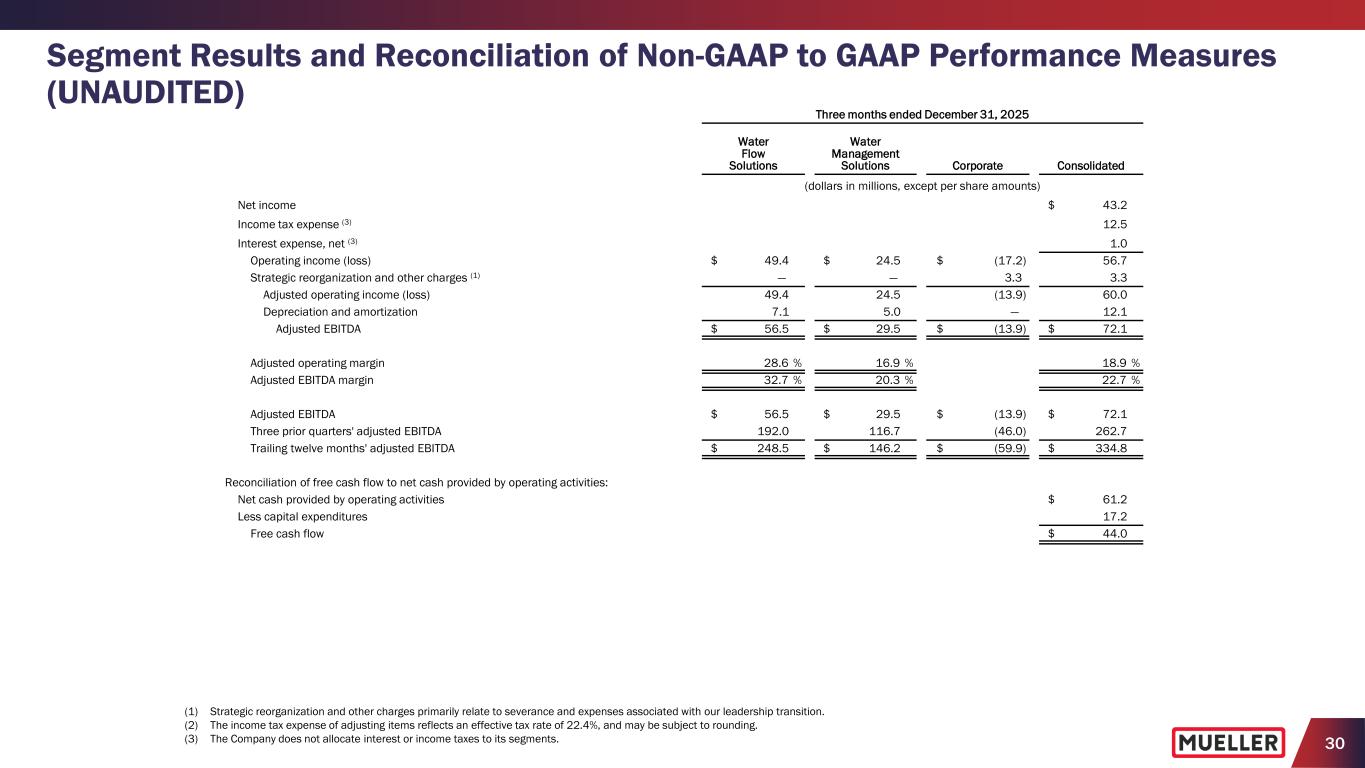 29 Segment Results and Reconciliation of Non-GAAP to GAAP Performance Measures (UNAUDITED) (1) Strategic reorganization and other charges primarily relate to severance and expenses associated with our leadership transition. (2) The income tax expense of adjusting items reflects an effective tax rate of 22.4%, and may be subject to rounding. Three months ended December 31, 2025 Water Flow Solutions Water Management Solutions Corporate Consolidated (dollars in millions, except per share amounts) Net sales $ 173.0 $ 145.2 $ — $ 318.2 Gross profit $ 70.8 $ 49.0 $ — $ 119.8 Selling, general and administrative expenses 21.4 24.5 13.9 59.8 Strategic reorganization and other charges (1) — — 3.3 3.3 Operating income (loss) $ 49.4 $ 24.5 $ (17.2) $ 56.7 Operating margin 28.6 % 16.9 % 17.8 % Capital expenditures $ 6.4 $ 10.8 $ — $ 17.2 Net income $ 43.2 Net income margin 13.6 % Reconciliation of non-GAAP to GAAP performance measures: Net income $ 43.2 Strategic reorganization and other charges (1) 3.3 Income tax expense of adjusting items (2) (0.7) Adjusted net income $ 45.8 Weighted average diluted shares outstanding 157.3 Net income per diluted share $ 0.27 Strategic reorganization and other charges per diluted share (1) 0.02 Income tax expense of adjusting items per diluted share (2) — Adjusted net income per diluted share $ 0.29