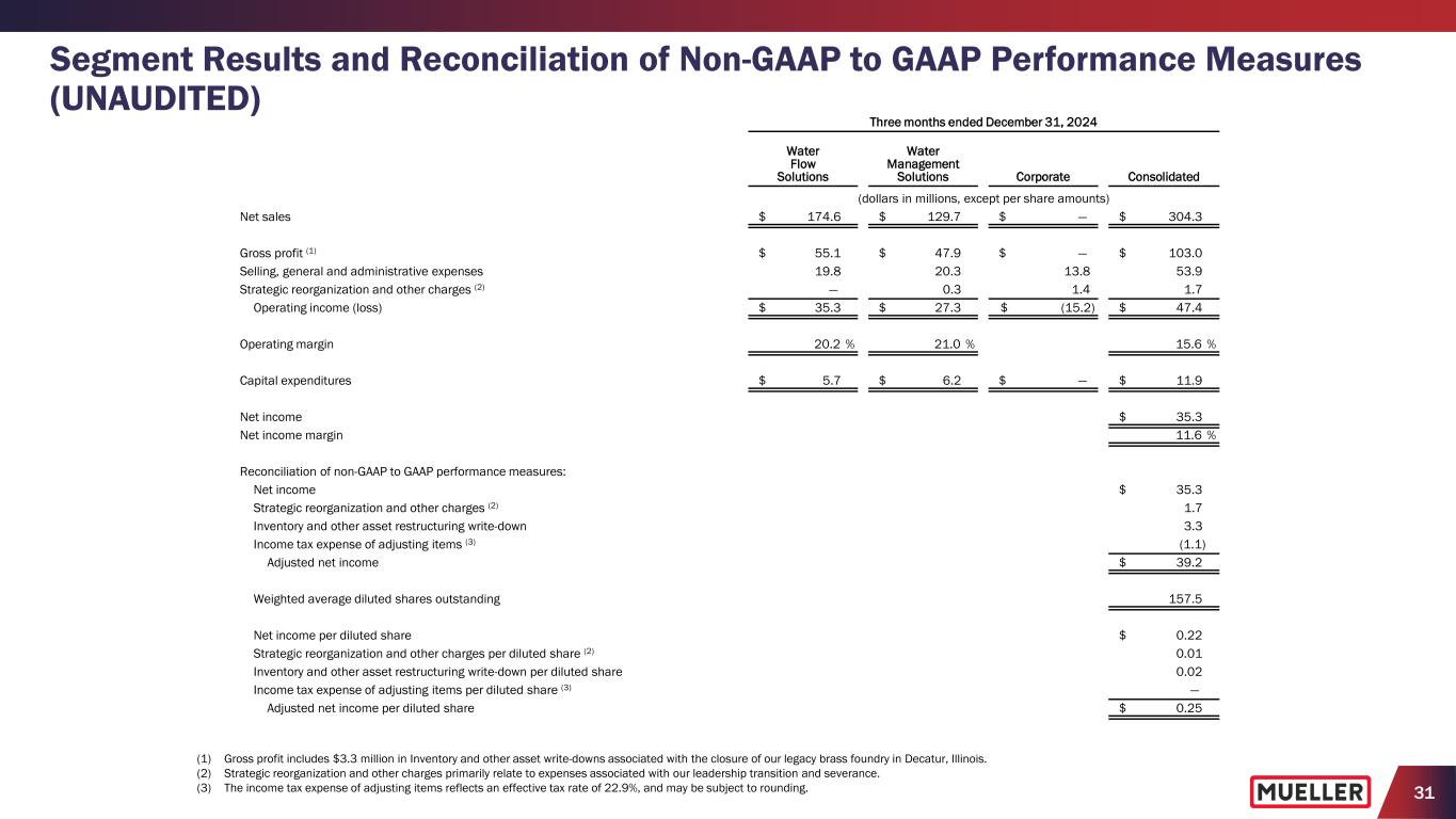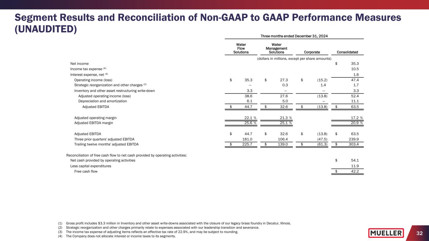 31 Segment Results and Reconciliation of Non-GAAP to GAAP Performance Measures (UNAUDITED) (1) Gross profit includes $3.3 million in Inventory and other asset write-downs associated with the closure of our legacy brass foundry in Decatur, Illinois. (2) Strategic reorganization and other charges primarily relate to expenses associated with our leadership transition and severance. (3) The income tax expense of adjusting items reflects an effective tax rate of 22.9%, and may be subject to rounding. Three months ended December 31, 2024 Water Flow Solutions Water Management Solutions Corporate Consolidated (dollars in millions, except per share amounts) Net sales $ 174.6 $ 129.7 $ — $ 304.3 Gross profit (1) $ 55.1 $ 47.9 $ — $ 103.0 Selling, general and administrative expenses 19.8 20.3 13.8 53.9 Strategic reorganization and other charges (2) — 0.3 1.4 1.7 Operating income (loss) $ 35.3 $ 27.3 $ (15.2) $ 47.4 Operating margin 20.2 % 21.0 % 15.6 % Capital expenditures $ 5.7 $ 6.2 $ — $ 11.9 Net income $ 35.3 Net income margin 11.6 % Reconciliation of non-GAAP to GAAP performance measures: Net income $ 35.3 Strategic reorganization and other charges (2) 1.7 Inventory and other asset restructuring write-down 3.3 Income tax expense of adjusting items (3) (1.1) Adjusted net income $ 39.2 Weighted average diluted shares outstanding 157.5 Net income per diluted share $ 0.22 Strategic reorganization and other charges per diluted share (2) 0.01 Inventory and other asset restructuring write-down per diluted share 0.02 Income tax expense of adjusting items per diluted share (3) — Adjusted net income per diluted share $ 0.25