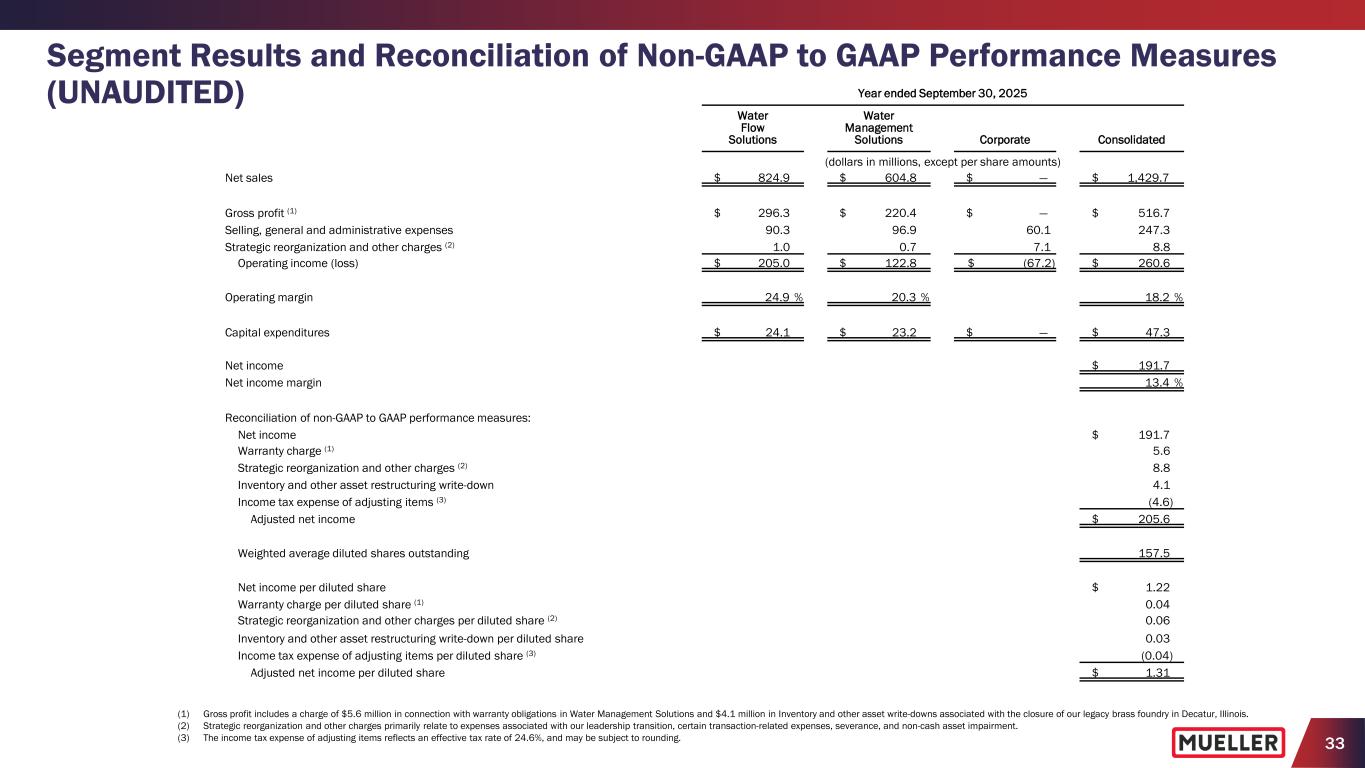 33 Segment Results and Reconciliation of Non-GAAP to GAAP Performance Measures (UNAUDITED) (1) Gross profit includes a charge of $5.6 million in connection with warranty obligations in Water Management Solutions and $4.1 million in Inventory and other asset write-downs associated with the closure of our legacy brass foundry in Decatur, Illinois. (2) Strategic reorganization and other charges primarily relate to expenses associated with our leadership transition, certain transaction-related expenses, severance, and non-cash asset impairment. (3) The income tax expense of adjusting items reflects an effective tax rate of 24.6%, and may be subject to rounding. Year ended September 30, 2025 Water Flow Solutions Water Management Solutions Corporate Consolidated (dollars in millions, except per share amounts) Net sales $ 824.9 $ 604.8 $ — $ 1,429.7 Gross profit (1) $ 296.3 $ 220.4 $ — $ 516.7 Selling, general and administrative expenses 90.3 96.9 60.1 247.3 Strategic reorganization and other charges (2) 1.0 0.7 7.1 8.8 Operating income (loss) $ 205.0 $ 122.8 $ (67.2) $ 260.6 Operating margin 24.9 % 20.3 % 18.2 % Capital expenditures $ 24.1 $ 23.2 $ — $ 47.3 Net income $ 191.7 Net income margin 13.4 % Reconciliation of non-GAAP to GAAP performance measures: Net income $ 191.7 Warranty charge (1) 5.6 Strategic reorganization and other charges (2) 8.8 Inventory and other asset restructuring write-down 4.1 Income tax expense of adjusting items (3) (4.6) Adjusted net income $ 205.6 Weighted average diluted shares outstanding 157.5 Net income per diluted share $ 1.22 Warranty charge per diluted share (1) 0.04 Strategic reorganization and other charges per diluted share (2) 0.06 Inventory and other asset restructuring write-down per diluted share 0.03 Income tax expense of adjusting items per diluted share (3) (0.04) Adjusted net income per diluted share $ 1.31