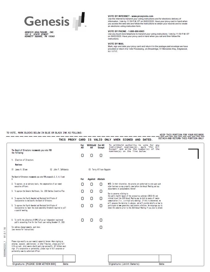 VOTE BY INTERNET - www.proxyvote.com Use the Internet to transmit your voting instructions and for electronic delivery of information. Vote by 11:59 P.M. ET on 06/02/2020. Have your proxy card in hand when you access the web site and follow the instructions to obtain your records and to create an electronic voting instruction form. VOTE BY PHONE - 1-800-690-6903 Use any touch-tone telephone to transmit your voting instructions. Vote by 11:59 P.M. ET on 06/02/2020. Have your proxy card in hand when you call and then follow the instructions. GENESIS HEALTHCARE, INC. 101 E. STATE STREET KENNETT SQUARE, PA 19348 VOTE BY MAIL Mark, sign and date your proxy card and return it in the postage-paid envelope we have provided or return it to Vote Processing, c/o Broadridge, 51 Mercedes Way, Edgewood, NY 11717. TO VOTE, MARK BLOCKS BELOW IN BLUE OR BLACK INK AS FOLLOWS: KEEP THIS PORTION FOR YOUR RECORDS DETACH AND RETURN THIS PORTION ONLY THIS PROXY CARD IS VALID ONLY WHEN SIGNED AND DATED. For All Withhold All For All Except To withhold authority to vote for any individual nominee(s), mark “For All Except” and write the number(s) of the The Board of Directors recommends you vote FOR the following: nominee(s) on the line below. 0 0 0 1. Election of Directors Nominees 01 James H. Bloem 02 John F. DePodesta 03 Terry Allison Rappuhn The Board of Directors recommends you vote FOR proposals 2, 3, 4, 5 and 6. For 0 0 0 0 Against 0 0 0 0 Abstain 0 0 0 0 2. To approve, on an advisory basis, the compensation of our named executive officers. NOTE: In their discretion, the proxies are authorized to vote upon such other business as may properly come before the Annual Meeting and any adjournments or postponements thereof. 3. To approve the Genesis Healthcare, Inc. 2020 Omnibus Incentive Plan. Due to concerns relating to the public health impact of the coronavirus outbreak (COVID-19) and related travel,the 2020 Annual Meeting may be held by means of remote communication (i.e., a virtual-only meeting). If this is determined, we will announce the decision in advance, and will provide details on how to participate at www.genesishcc.com/investor-relations. We encourage you to check this website prior to the 2020 Annual Meeting if you plan to attend. 4. To approve the Fourth Amended and Restated Certificate of Incorporation to declassify the Board of Directors. 5. To approve the Fourth Amended and Restated Certificate of Incorporation to lower the stock ownership threshold required to call a special meeting. 0 0 0 0 6. To ratify the selection of KPMG LLP as our independent registered public accounting firm for the fiscal year ending December 31, 2020. For address change/comments, mark here. (see reverse for instructions) Please sign exactly as your name(s) appear(s) hereon. When signing as attorney, executor, administrator, or other fiduciary, please give full title as such. Joint owners should each sign personally. All holders must sign. If a corporation or partnership, please sign in full corporate or partnership name by authorized officer. Signature [PLEASE SIGN WITHIN BOX] Date Signature (Joint Owners) Date 0000462223_1 R1.0.1.18