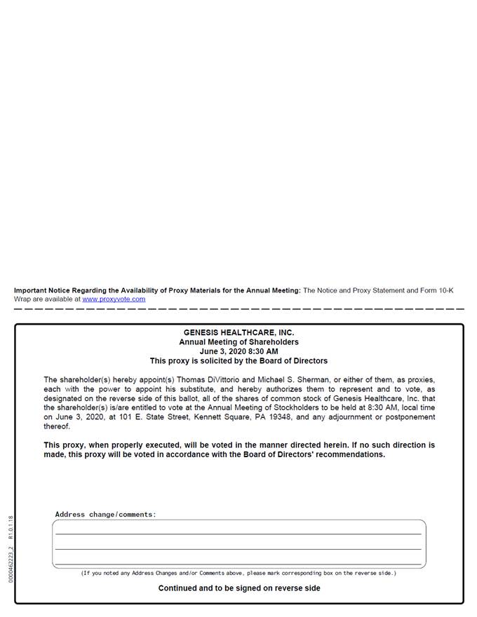 Important Notice Regarding the Availability of Proxy Materials for the Annual Meeting: The Notice and Proxy Statement and Form 10-K Wrap are available at www.proxyvote.com GENESIS HEALTHCARE, INC. Annual Meeting of Shareholders June 3, 2020 8:30 AM This proxy is solicited by the Board of Directors The shareholder(s) hereby appoint(s) Thomas DiVittorio and Michael S. Sherman, or either of them, as proxies, each with the power to appoint his substitute, and hereby authorizes them to represent and to vote, as designated on the reverse side of this ballot, all of the shares of common stock of Genesis Healthcare, Inc. that the shareholder(s) is/are entitled to vote at the Annual Meeting of Stockholders to be held at 8:30 AM, local time on June 3, 2020, at 101 E. State Street, Kennett Square, PA 19348, and any adjournment or postponement thereof. This proxy, when properly executed, will be voted in the manner directed herein. If no such direction is made, this proxy will be voted in accordance with the Board of Directors' recommendations. Address change/comments: (If you noted any Address Changes and/or Comments above, please mark corresponding box on the reverse side.) Continued and to be signed on reverse side 0000462223_2 R1.0.1.18