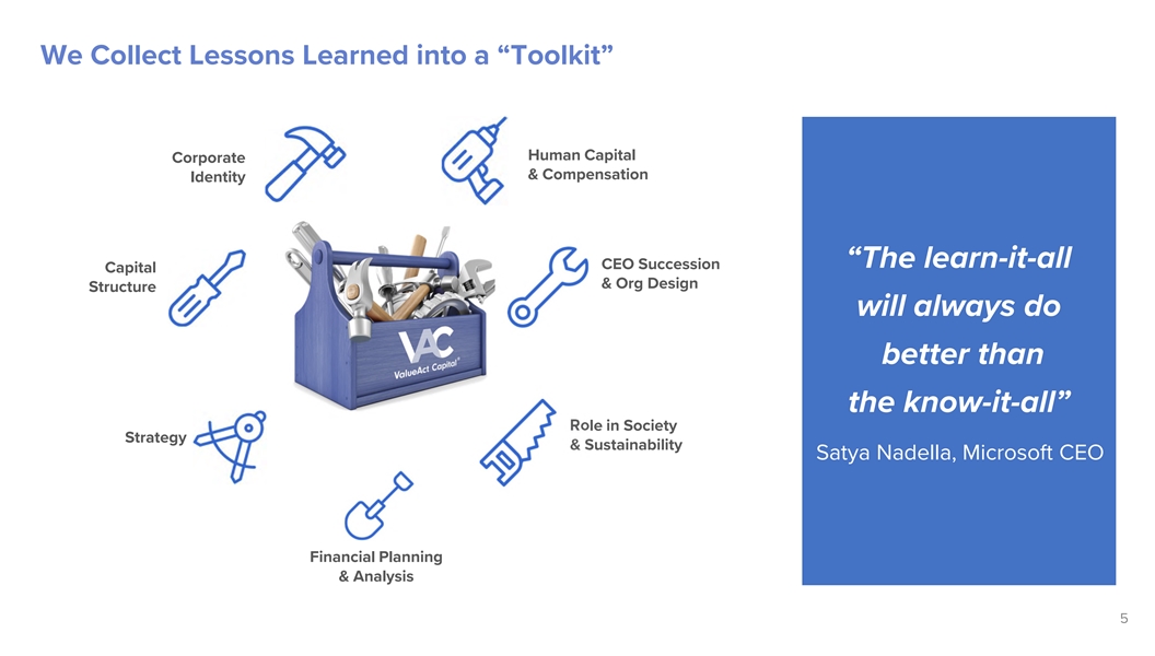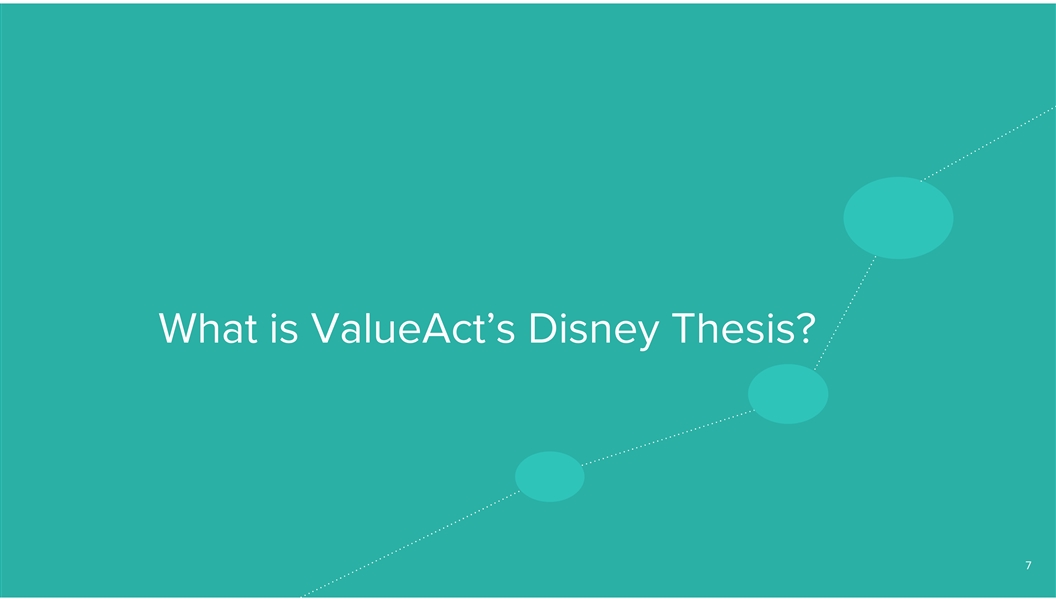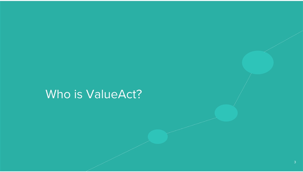Disclaimer This document has been prepared by ValueAct Capital Management, L.P. (“ValueAct Capital”). ValueAct Capital provides investment advisory services to private investment funds, which have an economic interest in the securities discussed herein. This document is for informational purposes only and should not be construed as investment advice for any person or entity. This document should not be relied upon for making an investment decision, including any decision to buy or sell any securities discussed herein. The views expressed herein reflect the views and subjective opinions of ValueAct Capital only through the date of the presentation and are subject to change at any time. Certain financial information and other data used in this document has been derived or obtained from sources that are considered reliable but are not guaranteed. ValueAct Capital reserves the right to change any of its opinions expressed in this document at any time as it deems appropriate and ValueAct Capital disclaims any obligation to correct, update or revise this document or to otherwise provide any additional materials to any recipient of this document. ValueAct Capital has not sought or obtained consent from any third party to use any of the statements or information that was obtained or derived from a third party, and the inclusion of such third-party statements or information should not be viewed as indicating the support of such third party. For the avoidance of doubt, this document has not been endorsed by The Walt Disney Company (“Disney”). ValueAct Capital recognizes that there may be information in the possession of Disney that could lead ValueAct Capital to change its opinions expressed in this document or could lead Disney or others to disagree with ValueAct Capital’s opinions. This document may contain “forward-looking statements” within the meaning of the Private Securities Litigation Reform Act of 1995, as amended, that reflect ValueAct Capital’s views with respect to, among other things, future events and financial performance, and actual results may vary materially from the results discussed in this document. Forward-looking statements can be identified by the use of forward-looking terminology, such as “may,” “will,” “should,” “expect,” “anticipate,” “target,” “project,” “estimate,” “intend,” “continue” or “believe,” or the negatives thereof or other variations thereon or comparable terminology. Forward-looking statements are subject to various risks and uncertainties and assumptions and there can be no assurance that any idea or assumption contained in this document is, or will be proven, correct. Due to various risks and uncertainties, actual events or results may differ materially from those reflected or contemplated in such forward-looking statements. Forward-looking statements should not be regarded as a representation by ValueAct Capital that the future plans, estimates or expectations contemplated will ever be achieved. Under no circumstances is this document to be used or considered as an offer to sell or a solicitation of an offer to buy any security, including, without limitation, any interest in any fund managed by ValueAct Capital. Any offer to purchase an interest in a ValueAct Capital fund would only be made at the time a qualified offeree receives the Confidential Memorandum of such fund. The terms of any investment in the ValueAct Capital funds shall be governed by the constituent documents for the relevant fund, which expressly do not include this document. Any investment in the funds is speculative and involves substantial risk, including the risk of losing all or substantially all of such investment. Through this document, ValueAct Capital is stating how it intends to vote at the next annual general meeting and the reasons therefor, and is not soliciting any proxy 2 in connection with that meeting.