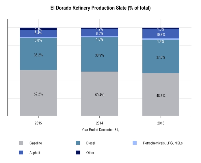 Our refining system processes a combination of light sweet and medium sour crude oils which, when refined, results in a product mix consisting principally of higher-value transportation fuels such as gasoline, distillate and jet fuel. A lesser portion of our overall production consists of residual products, including paving asphalt, roofing flux and other products with industrial applications.