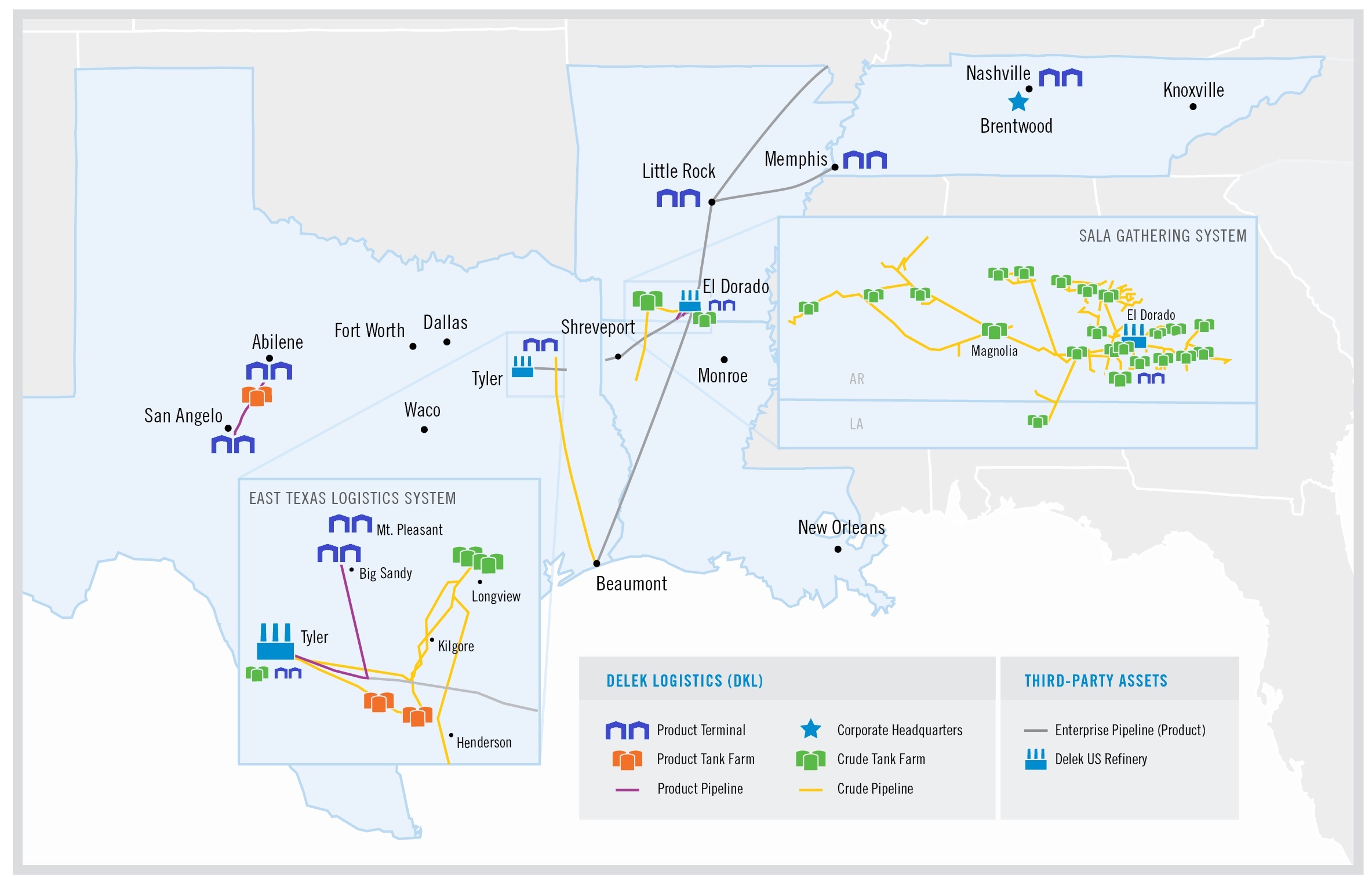 We own and operate two independent refineries located in Tyler, Texas and El Dorado, Arkansas, currently representing a combined 155,000 bpd of crude throughput capacity. Our refining system produces a variety of petroleum-based products used in transportation and industrial markets which are sold to a wide range of customers located principally in inland, domestic markets.