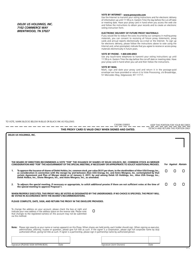 • | To consider and vote on a proposal to adopt the Agreement and Plan of Merger, dated as of January 2, 2017 as such agreement may be amended from time to time, which is referred to as the merger agreement, among Alon, Delek US Holdings, Inc., which is referred to as Delek, Delek Holdco, Inc., Dione Mergeco, Inc., and Astro Mergeco, Inc., which is referred to as the Alon merger proposal; |