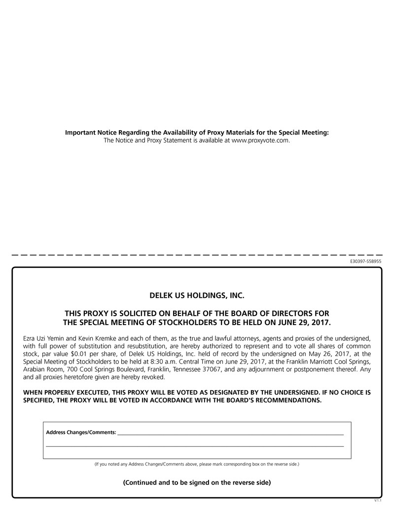 stock, par value $0.01 per share, of Delek US Holdings, Inc. held of record by the undersigned on May 26, 2017, at the