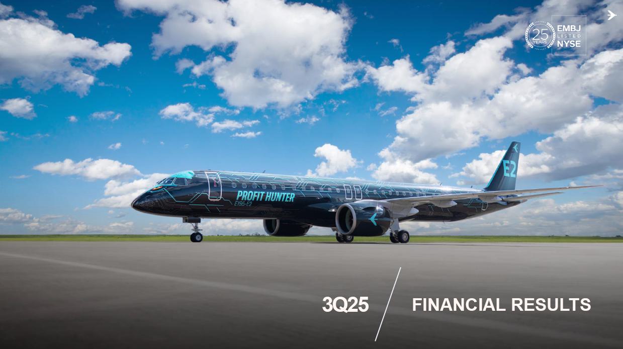 This information belongs to Embraer and cannot be used or reproduced without written permission PUBLIC INFORMATION from the Company. RESULTS3Q25 +2,000 Executive Jets delivered This information belongs to Embraer and cannot be used or reproduced without written permission PUBLIC INFORMATION from the Company. 2 DISCLAIMER This conference call may include statements about future events, based on Embraer's expectations and market financial trends. Such statements are subject to uncertainties that may cause actual results to differ from those expressed or implied in this conference call. Except in accordance with the applicable rules, the company assumes no obligation to publicly update any forward-looking statements. For detailed financial information, the company encourages reviewing publications filed by the company with the CVM. This information belongs to Embraer and cannot be used or reproduced without written permission PUBLIC INFORMATION from the Company. SUSTAINABLE GROWTH Driven by Efficiency and Innovation 3 Strong sales momentum with higher backlog across all BUs S&P rating upgrade to BBB High(er) margin across all BUs Substantial midterm growth and long-term focus on innovation Capacity increase and supply chain management Zero import tariffs push CULTURE FOUNDATION: SAFETY FIRST, QUALITY ALWAYS IN EVERYTHING WE DO! This information belongs to Embraer and cannot be used or reproduced without written permission PUBLIC INFORMATION from the Company. EXECUTIVE JETS EXPANSION: All time high 3Q revenues (c.$580 million) +2,000 business jets delivery, record 3Q deliveries 4 3Q25 HIGHLIGHTS Backlog$15.2 bn 2.7 btb* Backlog$4.9 bn 1.8 btb* Backlog$3.9 bn 1.3 btb* Backlog$7.3 bn 2.4 btb* GLOBAL DEFENSE SALES: Portugal 6th KC-390 purchase, along with 10 new options Panama (4) and SNC (1) sign A-29 acquisition agreements NEW ORDERS IN COMMERCIAL AVIATION: Avelo 50 E195-E2 plus 50 purchase rights LATAM 24 E195-E2 plus 50 options SERVICES SUSTAINABLE GROWTH: CommuteAir new maintenance agreement Starlink connectivity solution for Praetor and Legacy operators *btb= book-to-bill LTM This information belongs to Embraer and cannot be used or reproduced without written permission PUBLIC INFORMATION from the Company. 5 PRODUCTION LEAD TIME REDUCTION (2025 x 2021) PRAETOR KC-390 E-JETS 40% 33% 27% ¹ The gains indicated are based on the evolution compared to the baseline of each program over the past 5 years. 2025 2026 J F M A M J J A S O N D J F M A M J J A S O N D PRODUCTION LEVELING This information belongs to Embraer and cannot be used or reproduced without written permission PUBLIC INFORMATION from the Company. PRODUCTION CAPACITY INCREASE Flight Preparation Hangar #3Site: MLB Delivered: 1Q24 Paint PreparationBuildingSite: MLB Delivered: 1Q25 Flight PreparationHangarSite: GPX Delivered: 1Q25 Paint BoothCenterSite: GPX Delivered: 3Q25 Final AssemblyHangar ExpansionSite: GPX Delivered: 3Q25 Delivery CenterExpansionSite: MLB Delivery: 2Q26 AdditionalMachinerySite: BOT Delivery: 3Q26 Cabinetry shopExpansionSite: GPX Delivery: 3Q26 DRIVING EFFICIENCY CAPABILITY BUILDING DIGITAL & AI TRANSFORMATION AIRCRAFT DELIVERIES INCREASE * 16% AVERAGE SHORTAGES REDUCTION * 25% *Total Commercial Av. & Executive Av. & Defense Security 9M24 vs. 9M25 SUPPLY CHAIN MANAGEMENT 2.0 OPERATIONAL RESULTS 3Q25 This information belongs to Embraer and cannot be used or reproduced without written permission PUBLIC INFORMATION from the Company. 3Q24 3Q25 8 -5% 3Q24 1% 3Q25 16% 12% 583 562 618 473 Adj. EBIT margin Revenues (US$m) COMMERCIAL AVIATION EXECUTIVE AVIATION Revenue +4% yoy EBIT $71m (-23% yoy); margin +12.1% (-420bp)¹ Revenue +31% yoy EBIT $8m (+$31m yoy); margin +1.3% (+610bp) ¹ Ex U.S. import tariff +14.8% (-150bp yoy). This information belongs to Embraer and cannot be used or reproduced without written permission PUBLIC INFORMATION from the Company. 9 Revenue +16% yoy EBIT $68m (-15% yoy); margin +13.7% (-500bp)¹ Revenue +27% yoy EBIT $36m (+127% yoy); margin +12.9% (+570bp) DEFENSE & SECURITY SERVICES & SUPPORT Adj. EBIT margin Revenues (US$m) 3Q24 3Q25 7% 3Q24 13% 3Q25 19% 14% 493 426 278 220 ¹ Ex U.S. import tariff +14.0% (-460bp yoy). This information belongs to Embraer and cannot be used or reproduced without written permission PUBLIC INFORMATION from the Company. 10 FIRST FULL SCALE ENGINEERING PROTOTYPE TEST ENVELOPE FLIGHT SCHEDULED FOR LATE 2025 EARLY 2026 FINANCIAL RESULTS 3Q25 This information belongs to Embraer and cannot be used or reproduced without written permission PUBLIC INFORMATION from the Company. EXECUTIVE AVIATION Light Jets Midsize Jets COMMERCIAL AVIATION 3Q24 3Q25 41 41 3Q24 3Q25 7 GUIDANCE 2025: 77 to 85 9M25: 46 (57% mid-point; 55% 5Y avg) E1 E2 12 DELIVERIES GUIDANCE 2025: 145 to 155 9M25: 102 (68% mid-point; 57% 5Y avg) 23 22 19 18 12 4 13 7 16 20 +25% 0% This information belongs to Embraer and cannot be used or reproduced without written permission PUBLIC INFORMATION from the Company. US$ billion US$ million 14% 30% 31% 25% BREAKDOWN BY BUSINESS 3Q251 Services & Support Defense & Security Executive Aviation Commercial Aviation 1,692 3Q24 2,004 3Q25 +18% GUIDANCE 2025: US$7.0 – 7.5 billion 9M25: US$4,926 million (68% mid-point; 61% 5Y avg) 13 BACKLOG NET REVENUES ¹Revenue breakdown does not include “Others” Business Unit. +65% +8% +40% +37% 3.5 3.6 4.4 11.1 3Q24 4.9 3.9 7.3 15.2 3Q25 22.7 31.3 +38% 3Q25 + Options ~50.0 63% 21% 16% Options This information belongs to Embraer and cannot be used or reproduced without written permission PUBLIC INFORMATION from the Company. Reported EBITDA¹ 224 +11.2% 344 +20.3% 3Q24 3Q25 14 ADJUSTED EBITDA US$ million 160 +8.0% BREAKDOWN BY BUSINESS 3Q25 Reported EBIT¹ 3Q24 3Q25 Exec. D&S Com. S&S Other³ US$ million ADJUSTED EBIT 285 +16.9% Margin Margin 236 207 12.2% 11.8% 172 147 8.7% 8.6% 71 36 8 67 (10) ¹ Reported EBITDA and EBIT includes BA agreement and Eve expenses/warranties, all numbers from Eve are IFRS. ² Adjusted EBITDA and Adju