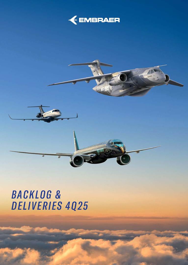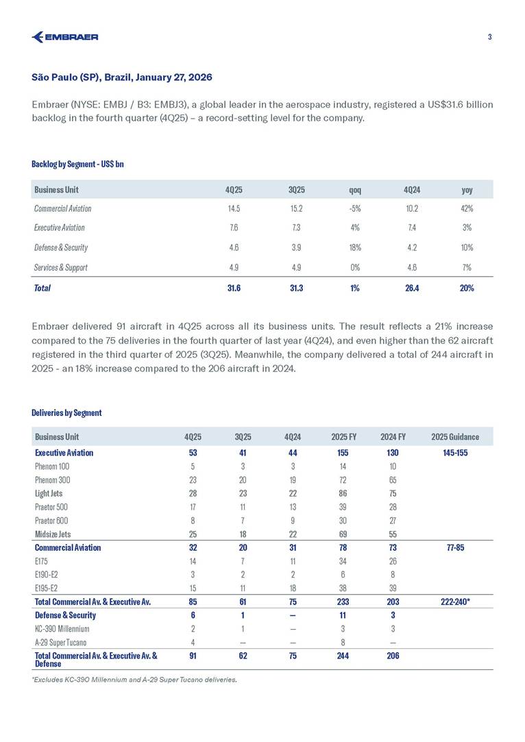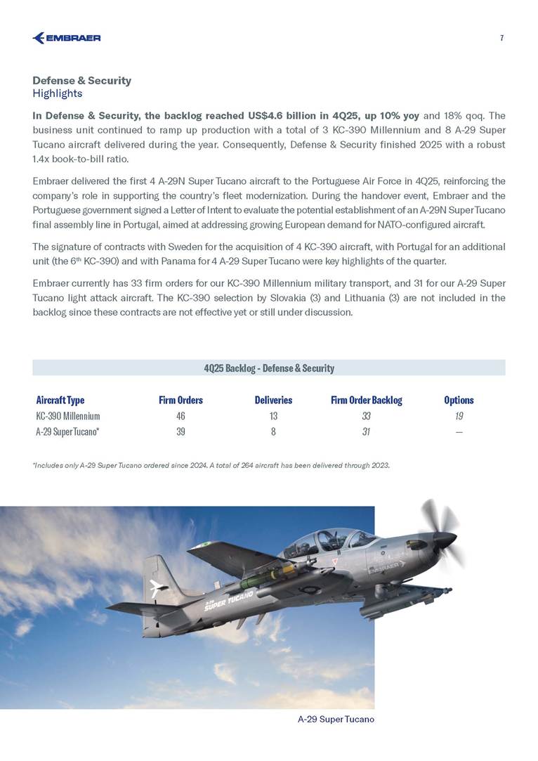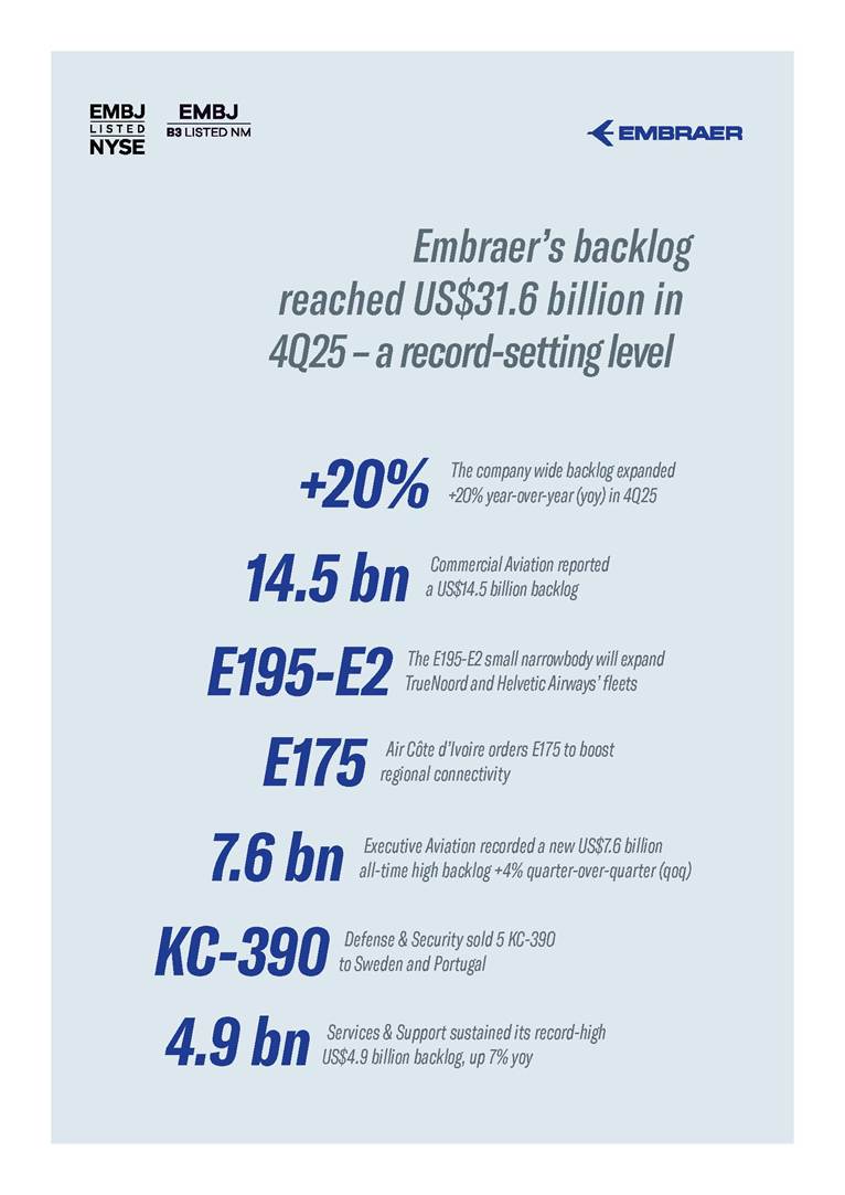 BACKLOG & DELIVERIES 4Q25 Embraer’s backlog reached US$31.6 billion in 4Q25 – a record‑setting level The company wide backlog expanded +20% year-over-year (yoy) in 4Q25 +20% The E195-E2 small narrowbody will expand TrueNoord and Helvetic Airways’ fleets E195-E2 Air Côte d’Ivoire orders E175 to boost regional connectivity E175 Commercial Aviation reported a US$14.5 billion backlog 14.5 bn Executive Aviation recorded a new US$7.6 billion all-time high backlog +4% quarter-over-quarter (qoq) 7.6 bn Defense & Security sold 5 KC-390 to Sweden and Portugal KC-390 Services & Support sustained its record-high US$4.9 billion backlog, up 7% yoy 4.9 bn 3 São Paulo (SP), Brazil, January 27, 2026 Embraer (NYSE: EMBJ / B3: EMBJ3), a global leader in the aerospace industry, registered a US$31.6 billion backlog in the fourth quarter (4Q25) – a record‑setting level for the company. Embraer delivered 91 aircraft in 4Q25 across all its business units. The result reflects a 21% increase compared to the 75 deliveries in the fourth quarter of last year (4Q24), and even higher than the 62 aircraft registered in the third quarter of 2025 (3Q25). Meanwhile, the company delivered a total of 244 aircraft in 2025 - an 18% increase compared to the 206 aircraft in 2024. Business Unit 4Q25 3Q25 4Q24 2025 FY 2024 FY 2025 Guidance Executive Aviation 53 41 44 155 130 145-155 Phenom 100 5 3 3 14 10 Phenom 300 23 20 19 72 65 Light Jets 28 23 22 86 75 Praetor 500 17 11 13 39 28 Praetor 600 8 7 9 30 27 Midsize Jets 25 18 22 69 55 Commercial Aviation 32 20 31 78 73 77-85 E175 14 7 11 34 26 E190-E2 3 2 2 6 8 E195-E2 15 11 18 38 39 Total Commercial Av. & Executive Av. 85 61 75 233 203 222-240* Defense & Security 6 1 — 11 3 KC-390 Millennium 2 1 — 3 3 A-29 Super Tucano 4 — — 8 — Total Commercial Av. & Executive Av. & Defense 91 62 75 244 206 Business Unit 4Q25 3Q25 qoq 4Q24 yoy Commercial Aviation 14.5 15.2 -5% 10.2 42% Executive Aviation 7.6 7.3 4% 7.4 3% Defense & Security 4.6 3.9 18% 4.2 10% Services & Support 4.9 4.9 0% 4.6 7% Total 31.6 31.3 1% 26.4 20% Backlog by Segment - US$ bn *Excludes KC-390 Millennium and A-29 Super Tucano deliveries. Deliveries by Segment 4 Commercial Aviation Highlights Commercial Aviation reported a US$14.5 billion backlog in 4Q25. The backlog was up 42% compared to 4Q24, but 5% lower than 3Q25 because of the renegotiation of Azul’s order during its Chapter 11 process. The business unit delivered 32 new aircraft in the last quarter of 2025 and 78 during the full year (in line with its 77-85 guidance for the period). Consequently, Commercial Aviation finished 2025 with a strong 2.8x book-to-bill ratio. During the quarter, Embraer announced TrueNoord and Helvetic Airways will expand their E‑Jet fleets. TrueNoord signed a firm order for 20 E195‑E2 jets—marking its first direct order with an aircraft manufacturer—which also includes purchase rights for up to an additional 20 E195‑E2s and up to 10 E175‑E1s. Meanwhile, Helvetic Airways reinforced its commitment to modern aviation with a firm order for 3 E195‑E2s and 5 additional purchase rights. 9% 12% 24% 23% 26% 20% 41% 45% The company also announced the E175 will join Air Côte d’Ivoire’s fleet. The airline has signed a firm order for 4 aircraft, with 8 additional purchase rights, to modernize its fleet and improve regional connectivity. First delivery is expected in the first half of 2027. Azul renegotiated its firm order for E195‑E2 aircraft, reducing the number of units from 51 to 25, as disclosed to the market on December 23, 2025. The renegotiation took place amid Azul’s Chapter 11 process. The models delivered during the period were the E175 to American Airlines (6), Republic Airlines (3) and SkyWest (5); the E190-E2 to Azorra (3); and the E195-E2 to AerCap (7), Azorra (1), Luxair (1), Mexicana (2) and Porter (4). E190-E2 5 4Q25 Backlog - Commercial Aviation Aircraft Type Firm Orders Deliveries Firm Order Backlog Options and Purchase Rights E195-E2 401 166 235 221 E190-E2 67 33 34 64 E175 1,003 813 190 118 Total 1,471 1,012 459 403 Commercial Aviation Backlog per aircraft model Customer (Country) Firm Orders Deliveries Firm Order Backlog Embraer 190-E2 67 33 34 ANA (Japan) 15 - 15 Mexicana (Mexico) 10 - 10 Virgin Australia (Australia) 4 - 4 Aircastle (USA) 2 - 2 Azorra (USA) 16 14 2 Air Kiribati (Kiribati) 2 1 1 AerCap (Ireland) 5 5 - Helvetic (Switzerland) 8 8 - Placar Linhas Aéreas (Brazil) 1 1 - Undisclosed 1 1 - Wideroe (Norway) 3 3 - Customer (Country) Firm Orders Deliveries Firm Order Backlog Embraer 195-E2 401 166 235 Avelo (USA) 50 - 50 SAS (Sweden) 45 - 45 Azul (Brazil) 25 - 25 LATAM (Chile) 24 - 24 Porter (Canada) 75 52 23 TrueNoord (The Netherlands) 20 - 20 Air Peace (Nigeria) 16 5 11 Azorra (USA) 23 16 7 Salam Air (Oman) 6 - 6 AerCap (Ireland) 43 38 5 Aircastle (USA) 23 18 5 Mexicana (Mexico) 10 5 5 Luxair (Luxembourg) 6 1 5 Helvetic (Switzerland) 7 4 3 Royal Jordanian (Jordan) 2 1 1 Binter Canarias (Spain) 16 16 - ICBC (China) 10 10 - Customer (Country) Firm Orders Deliveries Firm Order Backlog Embraer 175 1,003 813 190 American Airlines (USA) 204 124 80 SkyWest (USA) 288 219 69 Republic Airlines (USA) 187 158 29 Air Côte d’Ivoire (Ivory Coast) 4 - 4 Horizon Air / Alaska (USA) 50 47 3 Air Peace (Nigeria) 2 - 2 Undisclosed III 3 1 2 Overland Airways (Nigeria) 3 2 1 Air Canada (Canada) 15 15 - Air Lease (USA) 8 8 - Alitalia (Italy) 2 2 - Belavia (Belarus) 1 1 - CIT (USA) 4 4 - ECC Leasing (Ireland)* 1 1 - Flybe (UK) 11 11 - Fuji Dream (Japan) 2 2 - GECAS (USA) 5 5 - KLM (The Netherlands) 17 17 - LOT Polish (Poland) 12 12 - Mauritania Airlines (Mauritania) 2 2 - Mesa (USA) 7 7 - NAC / Aldus (Ireland) 2 2 - NAC / Jetscape (USA) 4 4 - Northwest (USA) 36 36 - Oman Air (Oman) 5 5 - Royal Jordanian (Jordan) 2 2 - Suzuyo (Japan) 11 11 - TRIP (Brazil) 5 5 - United Airlines (USA) 110 110 - * Aircraft delivered by ECC Leasing: one to Air Caraibes. 6 Executive Aviation Highlights Executive Av