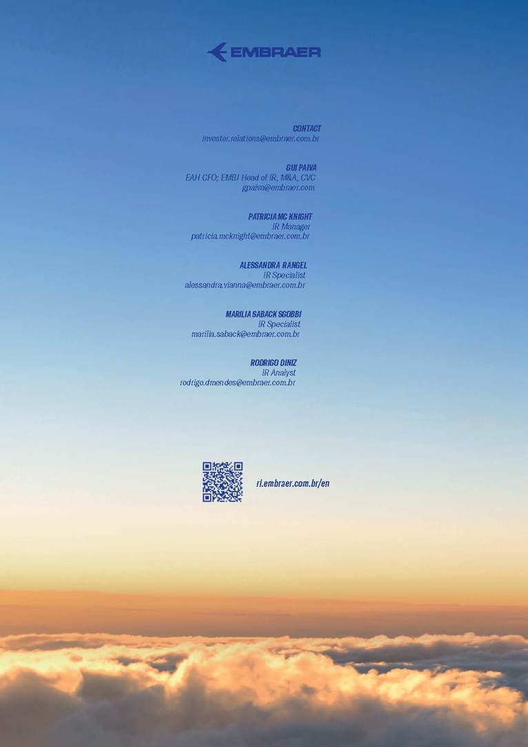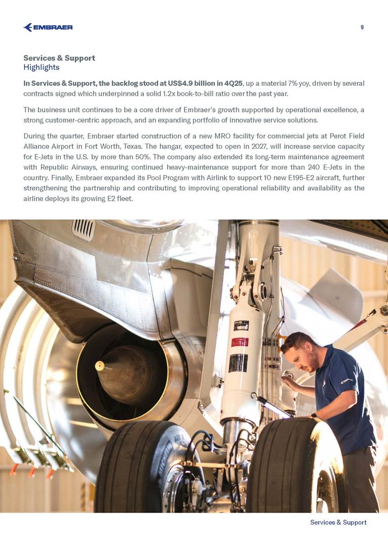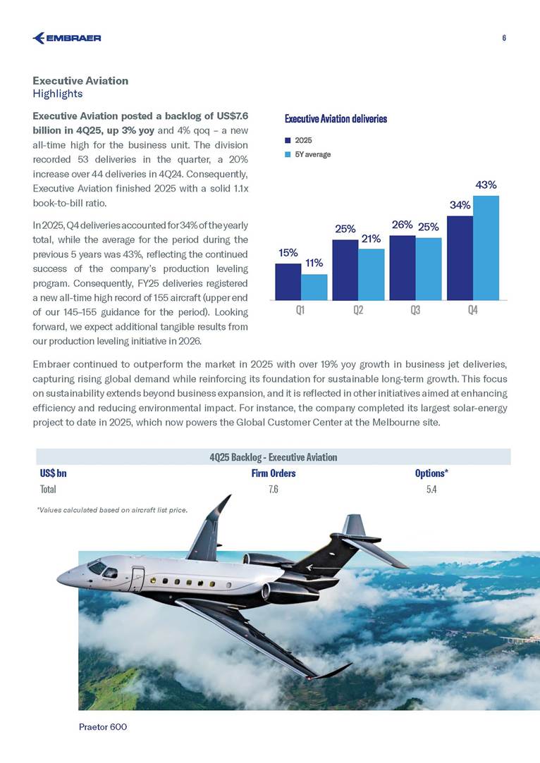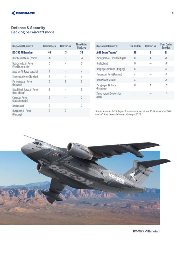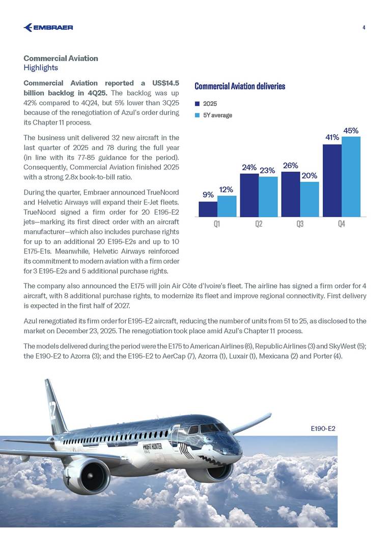 BACKLOG & DELIVERIES 4Q25 Embraer’s backlog reached US$31.6 billion in 4Q25 – a record‑setting level The company wide backlog expanded +20% year-over-year (yoy) in 4Q25 +20% The E195-E2 small narrowbody will expand TrueNoord and Helvetic Airways’ fleets E195-E2 Air Côte d’Ivoire orders E175 to boost regional connectivity E175 Commercial Aviation reported a US$14.5 billion backlog 14.5 bn Executive Aviation recorded a new US$7.6 billion all-time high backlog +4% quarter-over-quarter (qoq) 7.6 bn Defense & Security sold 5 KC-390 to Sweden and Portugal KC-390 Services & Support sustained its record-high US$4.9 billion backlog, up 7% yoy 4.9 bn 3 São Paulo (SP), Brazil, January 27, 2026 Embraer (NYSE: EMBJ / B3: EMBJ3), a global leader in the aerospace industry, registered a US$31.6 billion backlog in the fourth quarter (4Q25) – a record‑setting level for the company. Embraer delivered 91 aircraft in 4Q25 across all its business units. The result reflects a 21% increase compared to the 75 deliveries in the fourth quarter of last year (4Q24), and even higher than the 62 aircraft registered in the third quarter of 2025 (3Q25). Meanwhile, the company delivered a total of 244 aircraft in 2025 - an 18% increase compared to the 206 aircraft in 2024. Business Unit 4Q25 3Q25 4Q24 2025 FY 2024 FY 2025 Guidance Executive Aviation 53 41 44 155 130 145-155 Phenom 100 5 3 3 14 10 Phenom 300 23 20 19 72 65 Light Jets 28 23 22 86 75 Praetor 500 17 11 13 39 28 Praetor 600 8 7 9 30 27 Midsize Jets 25 18 22 69 55 Commercial Aviation 32 20 31 78 73 77-85 E175 14 7 11 34 26 E190-E2 3 2 2 6 8 E195-E2 15 11 18 38 39 Total Commercial Av. & Executive Av. 85 61 75 233 203 222-240* Defense & Security 6 1 — 11 3 KC-390 Millennium 2 1 — 3 3 A-29 Super Tucano 4 — — 8 — Total Commercial Av. & Executive Av. & Defense 91 62 75 244 206 Business Unit 4Q25 3Q25 qoq 4Q24 yoy Commercial Aviation 14.5 15.2 -5% 10.2 42% Executive Aviation 7.6 7.3 4% 7.4 3% Defense & Security 4.6 3.9 18% 4.2 10% Services & Support 4.9 4.9 0% 4.6 7% Total 31.6 31.3 1% 26.4 20% Backlog by Segment - US$ bn *Excludes KC-390 Millennium and A-29 Super Tucano deliveries. Deliveries by Segment 4 Commercial Aviation Highlights Commercial Aviation reported a US$14.5 billion backlog in 4Q25. The backlog was up 42% compared to 4Q24, but 5% lower than 3Q25 because of the renegotiation of Azul’s order during its Chapter 11 process. The business unit delivered 32 new aircraft in the last quarter of 2025 and 78 during the full year (in line with its 77-85 guidance for the period). Consequently, Commercial Aviation finished 2025 with a strong 2.8x book-to-bill ratio. During the quarter, Embraer announced TrueNoord and Helvetic Airways will expand their E‑Jet fleets. TrueNoord signed a firm order for 20 E195‑E2 jets—marking its first direct order with an aircraft manufacturer—which also includes purchase rights for up to an additional 20 E195‑E2s and up to 10 E175‑E1s. Meanwhile, Helvetic Airways reinforced its commitment to modern aviation with a firm order for 3 E195‑E2s and 5 additional purchase rights. 9% 12% 24% 23% 26% 20% 41% 45% The company also announced the E175 will join Air Côte d’Ivoire’s fleet. The airline has signed a firm order for 4 aircraft, with 8 additional purchase rights, to modernize its fleet and improve regional connectivity. First delivery is expected in the first half of 2027. Azul renegotiated its firm order for E195‑E2 aircraft, reducing the number of units from 51 to 25, as disclosed to the market on December 23, 2025. The renegotiation took place amid Azul’s Chapter 11 process. The models delivered during the period were the E175 to American Airlines (6), Republic Airlines (3) and SkyWest (5); the E190-E2 to Azorra (3); and the E195-E2 to AerCap (7), Azorra (1), Luxair (1), Mexicana (2) and Porter (4). E190-E2 5 4Q25 Backlog - Commercial Aviation Aircraft Type Firm Orders Deliveries Firm Order Backlog Options and Purchase Rights E195-E2 401 166 235 221 E190-E2 67 33 34 64 E175 1,003 813 190 118 Total 1,471 1,012 459 403 Commercial Aviation Backlog per aircraft model Customer (Country) Firm Orders Deliveries Firm Order Backlog Embraer 190-E2 67 33 34 ANA (Japan) 15 - 15 Mexicana (Mexico) 10 - 10 Virgin Australia (Australia) 4 - 4 Aircastle (USA) 2 - 2 Azorra (USA) 16 14 2 Air Kiribati (Kiribati) 2 1 1 AerCap (Ireland) 5 5 - Helvetic (Switzerland) 8 8 - Placar Linhas Aéreas (Brazil) 1 1 - Undisclosed 1 1 - Wideroe (Norway) 3 3 - Customer (Country) Firm Orders Deliveries Firm Order Backlog Embraer 195-E2 401 166 235 Avelo (USA) 50 - 50 SAS (Sweden) 45 - 45 Azul (Brazil) 25 - 25 LATAM (Chile) 24 - 24 Porter (Canada) 75 52 23 TrueNoord (The Netherlands) 20 - 20 Air Peace (Nigeria) 16 5 11 Azorra (USA) 23 16 7 Salam Air (Oman) 6 - 6 AerCap (Ireland) 43 38 5 Aircastle (USA) 23 18 5 Mexicana (Mexico) 10 5 5 Luxair (Luxembourg) 6 1 5 Helvetic (Switzerland) 7 4 3 Royal Jordanian (Jordan) 2 1 1 Binter Canarias (Spain) 16 16 - ICBC (China) 10 10 - Customer (Country) Firm Orders Deliveries Firm Order Backlog Embraer 175 1,003 813 190 American Airlines (USA) 204 124 80 SkyWest (USA) 288 219 69 Republic Airlines (USA) 187 158 29 Air Côte d’Ivoire (Ivory Coast) 4 - 4 Horizon Air / Alaska (USA) 50 47 3 Air Peace (Nigeria) 2 - 2 Undisclosed III 3 1 2 Overland Airways (Nigeria) 3 2 1 Air Canada (Canada) 15 15 - Air Lease (USA) 8 8 - Alitalia (Italy) 2 2 - Belavia (Belarus) 1 1 - CIT (USA) 4 4 - ECC Leasing (Ireland)* 1 1 - Flybe (UK) 11 11 - Fuji Dream (Japan) 2 2 - GECAS (USA) 5 5 - KLM (The Netherlands) 17 17 - LOT Polish (Poland) 12 12 - Mauritania Airlines (Mauritania) 2 2 - Mesa (USA) 7 7 - NAC / Aldus (Ireland) 2 2 - NAC / Jetscape (USA) 4 4 - Northwest (USA) 36 36 - Oman Air (Oman) 5 5 - Royal Jordanian (Jordan) 2 2 - Suzuyo (Japan) 11 11 - TRIP (Brazil) 5 5 - United Airlines (USA) 110 110 - * Aircraft delivered by ECC Leasing: one to Air Caraibes. 6 Executive Aviation Highlights Executive Av