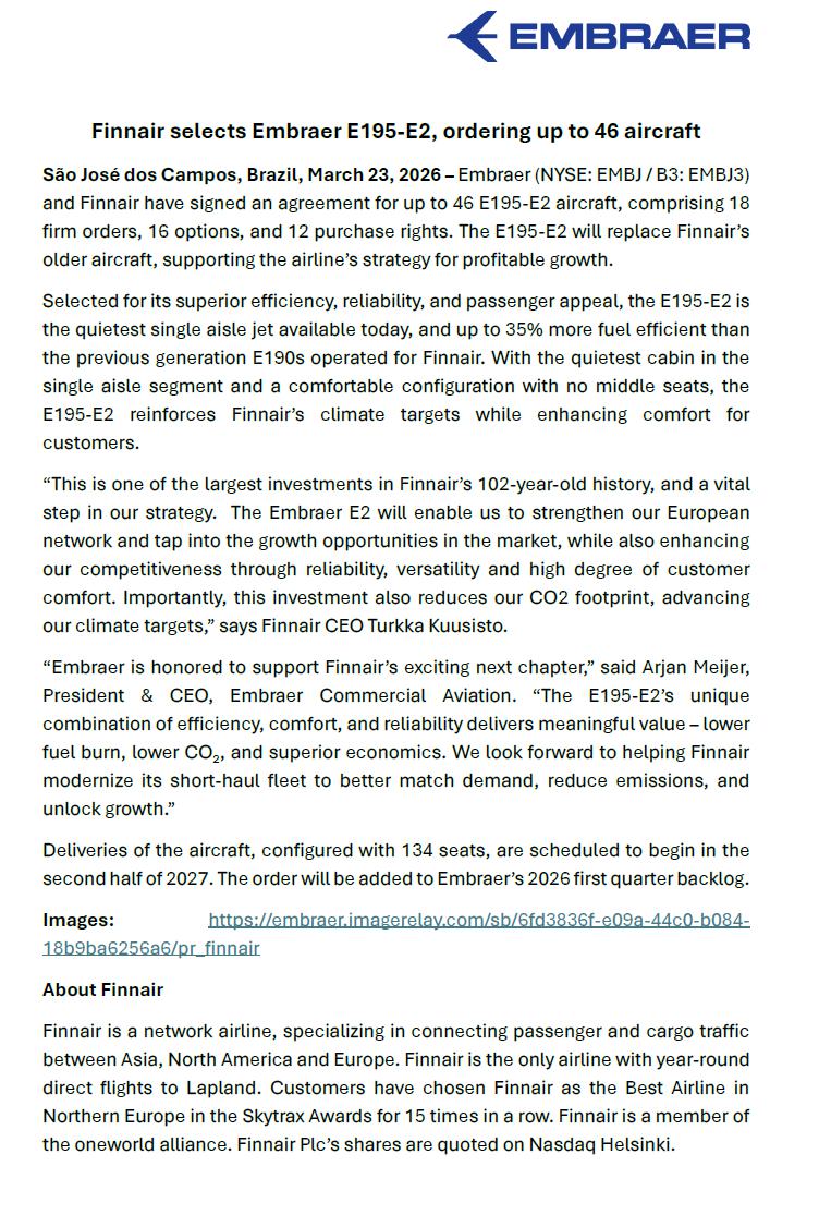 Finnair selects Embraer E195-E2, ordering up to 46 aircraft São José dos Campos, Brazil, March 23, 2026 – Embraer (NYSE: EMBJ / B3: EMBJ3) and Finnair have signed an agreement for up to 46 E195-E2 aircraft, comprising 18 firm orders, 16 options, and 12 purchase rights. The E195-E2 will replace Finnair’s older aircraft, supporting the airline’s strategy for profitable growth. Selected for its superior efficiency, reliability, and passenger appeal, the E195-E2 is the quietest single aisle jet available today, and up to 35% more fuel efficient than the previous generation E190s operated for Finnair. With the quietest cabin in the single aisle segment and a comfortable configuration with no middle seats, the E195-E2 reinforces Finnair’s climate targets while enhancing comfort for customers. “This is one of the largest investments in Finnair’s 102-year-old history, and a vital step in our strategy. The Embraer E2 will enable us to strengthen our European network and tap into the growth opportunities in the market, while also enhancing our competitiveness through reliability, versatility and high degree of customer comfort. Importantly, this investment also reduces our CO2 footprint, advancing our climate targets,” says Finnair CEO Turkka Kuusisto. “Embraer is honored to support Finnair’s exciting next chapter,” said Arjan Meijer, President & CEO, Embraer Commercial Aviation. “The E195-E2’s unique combination of efficiency, comfort, and reliability delivers meaningful value – lower fuel burn, lower CO₂, and superior economics. We look forward to helping Finnair modernize its short-haul fleet to better match demand, reduce emissions, and unlock growth.” Deliveries of the aircraft, configured with 134 seats, are scheduled to begin in the second half of 2027. The order will be added to Embraer’s 2026 first quarter backlog. Images: https://embraer.imagerelay.com/sb/6fd3836f-e09a-44c0-b084-18b9ba6256a6/pr_finnair About Finnair Finnair is a network airline, specializing in connecting passenger and cargo traffic between Asia, North America and Europe. Finnair is the only airline with year-round direct flights to Lapland. Customers have chosen Finnair as the Best Airline in Northern Europe in the Skytrax Awards for 15 times in a row. Finnair is a member of the oneworld alliance. Finnair Plc’s shares are quoted on Nasdaq Helsinki. About Embraer Embraer is a global aerospace company headquartered in Brazil. It manufactures aircraft for Commercial and Executive aviation, Defense & Security, and Agricultural customers. The company also provides after-sales services & support through a worldwide network of wholly owned entities and authorized agents. Since it was founded in 1969, Embraer has delivered more than 9,000 aircraft. On average, about every 10 seconds, an aircraft manufactured by Embraer takes off somewhere worldwide, transporting over 150 million passengers a year. Embraer is the leading manufacturer of commercial jets with up to 150 seats and is the leading exporter of high-value-added goods in Brazil. The company maintains industrial units, offices, service and parts distribution centers across the Americas, Africa, Asia, and Europe.