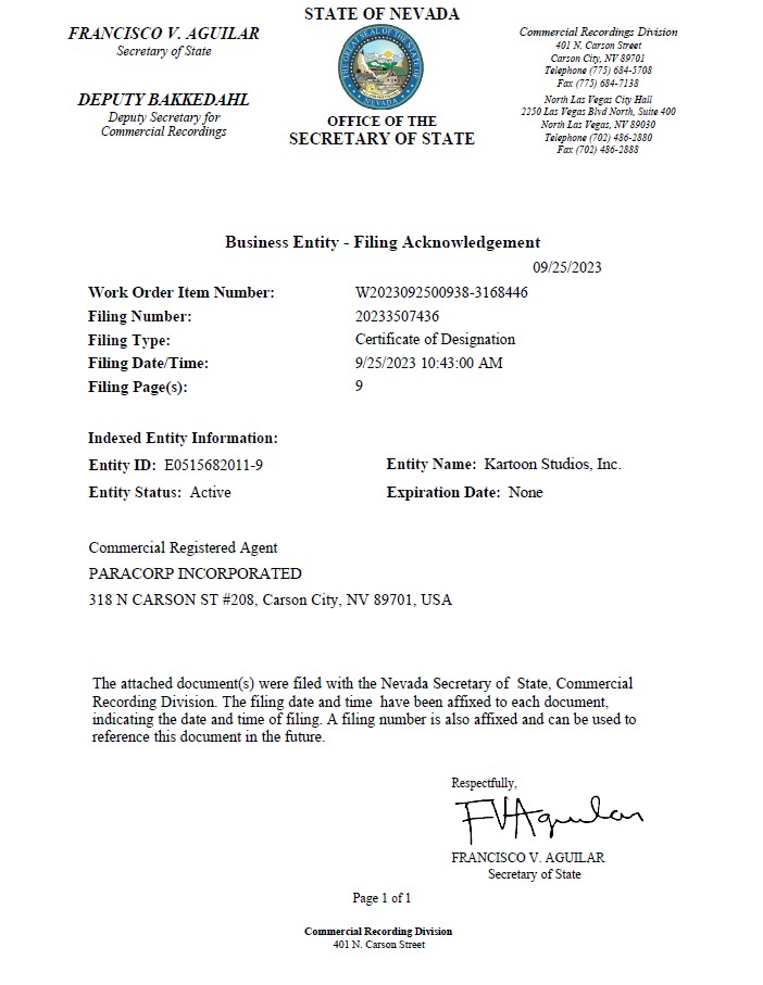 Business Entity - Filing Acknowledgement 09/25/2023 Work Order Item Number: Filing Number: Filing Type: Filing Date/Time: Filing Page(s): W2023092500938 - 3168446 20233507436 Certificate of Designation 9/25/2023 10:43:00 AM 9 Indexed Entity Information: Entity ID: E0515682011 - 9 Entity Status: Active Entity Name: Kartoon Studios, Inc. Expiration Date: None Commercial Registered Agent PARACORP INCORPORATED 318 N CARSON ST #208, Carson City, NV 89701, USA FRANCISCO V. AGUILAR Secretary of State DEPUTY BAKKEDAHL Deputy Secretary for Commercial Recordings STATE OF NEVADA OFFICE OF THE SECRETARY OF STATE Commercial Recordings Division 401 N. Carson Street Carson City, NV 89701 Telephone (775) 684 - 5708 Fax (775) 684 - 7138 North Las Vegas City Hall 2250 Las Vegas Blvd North, Suite 400 North Las Vegas, NV 89030 Telephone (702) 486 - 2880 Fax (702) 486 - 2888 The attached document(s) were filed with the Nevada Secretary of State, Commercial Recording Division. The filing date and time have been affixed to each document, indicating the date and time of filing. A filing number is also affixed and can be used to reference this document in the future. Respectfully, FRANCISCO V. AGUILAR Secretary of State Page 1 of 1 Commercial Recording Division 401 N. Carson Street