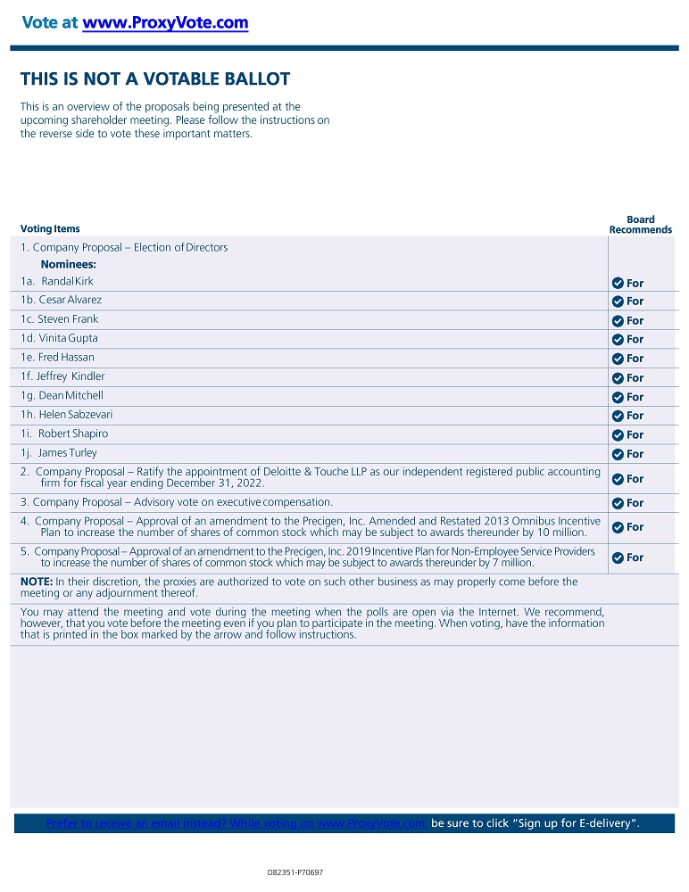 Vote at www.ProxyVote.com THIS IS NOT A VOTABLE BALLOT This is an overview of the proposals being presented at the upcoming shareholder meeting. Please follow the instructions on the reverse side to vote these important matters. Prefer to receive an email instead? While voting on www.ProxyVote.com, be sure to click “Sign up for E - delivery”. Voting Items Board Recommends D82351 - P70697 1. Company Proposal – Election of Directors Nominees: 1a. Randal Kirk For 1b. Cesar Alvarez For 1c. Steven Frank For 1d. Vinita Gupta For 1e. Fred Hassan For 1f. Jeffrey Kindler For 1g. Dean Mitchell For 1h. Helen Sabzevari For 1i. Robert Shapiro For 1j. James Turley For 2. Company Proposal – Ratify the appointment of Deloitte & Touche LLP as our independent registered public accounting firm for fiscal year ending December 31, 2022. For 3. Company Proposal – Advisory vote on executive compensation. For 4. Company Proposal – Approval of an amendment to the Precigen, Inc. Amended and Restated 2013 Omnibus Incentive Plan to increase the number of shares of common stock which may be subject to awards thereunder by 10 million. For 5. Company Proposal – Approval of an amendment to the Precigen, Inc. 2019 Incentive Plan for Non - Employee Service Providers to increase the number of shares of common stock which may be subject to awards thereunder by 7 million. For NOTE: In their discretion, the proxies are authorized to vote on such other business as may properly come before the meeting or any adjournment thereof. You may attend the meeting and vote during the meeting when the polls are open via the Internet . We recommend, however, that you vote before the meeting even if you plan to participate in the meeting . When voting, have the information that is printed in the box marked by the arrow and follow instructions .