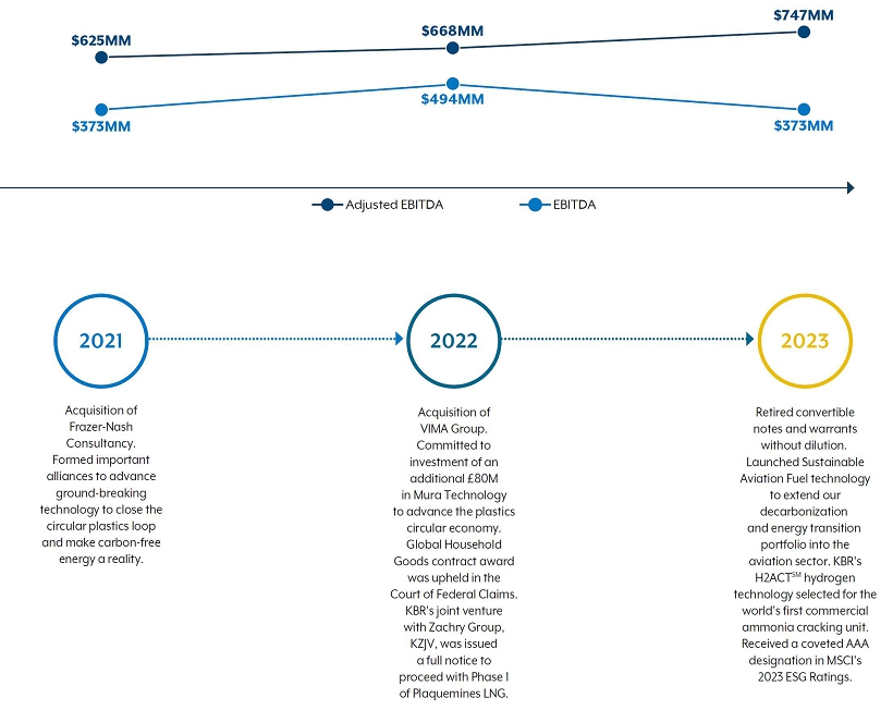 | * | EBITDA is defined as net income (loss) attributable to KBR, plus interest expense; accretion of convertible notes debt discounts; other non-operating expense (income); provision for income taxes; and depreciation and amortization. Adjusted EBITDA excludes certain amounts included in EBITDA. A reconciliation of adjusted EBITDA to net income is provided under the section titled “Non-GAAP Financial Information” at the end of this proxy statement. |