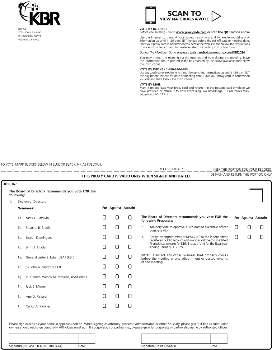 The accompanying proxy is solicited by the Board of Directors of KBR, Inc. By executing and returning the enclosed proxy or by following the online or telephone voting instructions, you authorize the individuals named in the proxy to represent you and vote your shares on the matters described in the Notice of Annual Meeting of Stockholders. Your proxy will be effective for the May 15, 2024, meeting and at any adjournment or postponement of that meeting.
