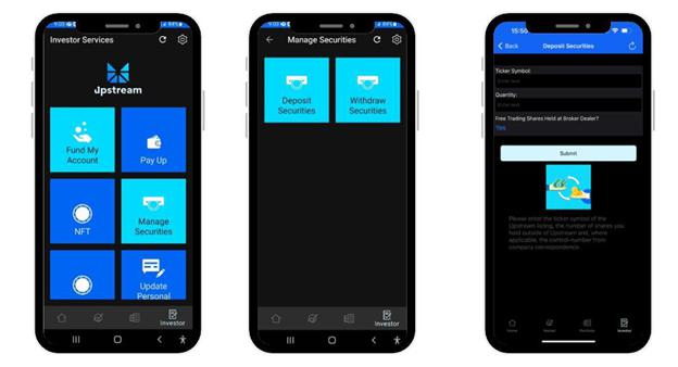 For non-U.S. persons only, Open Upstream, Tap Investor, Manage Securities, Deposit Securities. Next, Enter the Company’s Ticker Symbol and Number of Shares you’re requesting to deposit. Confirm whether your shares are free trading or restricted, then tap Submit.