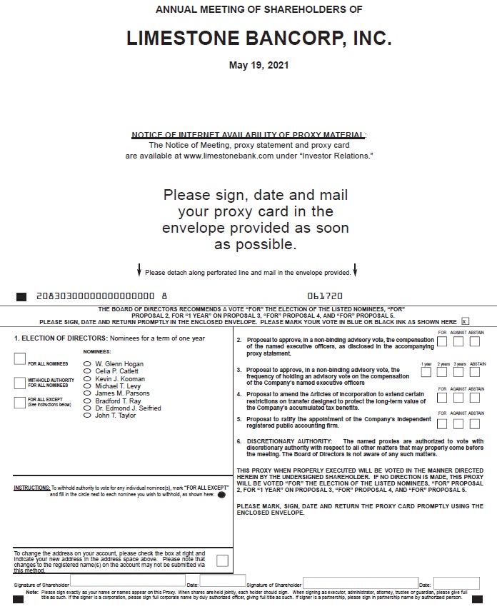 The Annual Meeting of Shareholders of Limestone Bancorp, Inc. will be held on Wednesday, May 19, 2021, at 9:00 a.m. EDT in the Conference Center on the second floor of our main office located at