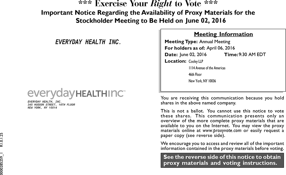 EVERYDAY HEALTH INC.Meeting Information Meeting Type: Annual Meeting For holders as of: April 06, 2016 Date: June 02, 2016 Time:9:30 AM EDT Location: Cooley LLP 1114 Avenue of the Americas 46th Floor New York, NY 10036 everyday HEALTH inc TM EVERYDAY HEALTH, INC. 345 HUDSON STREET, 16TH FLOOR NEW YORK, NY 10014
